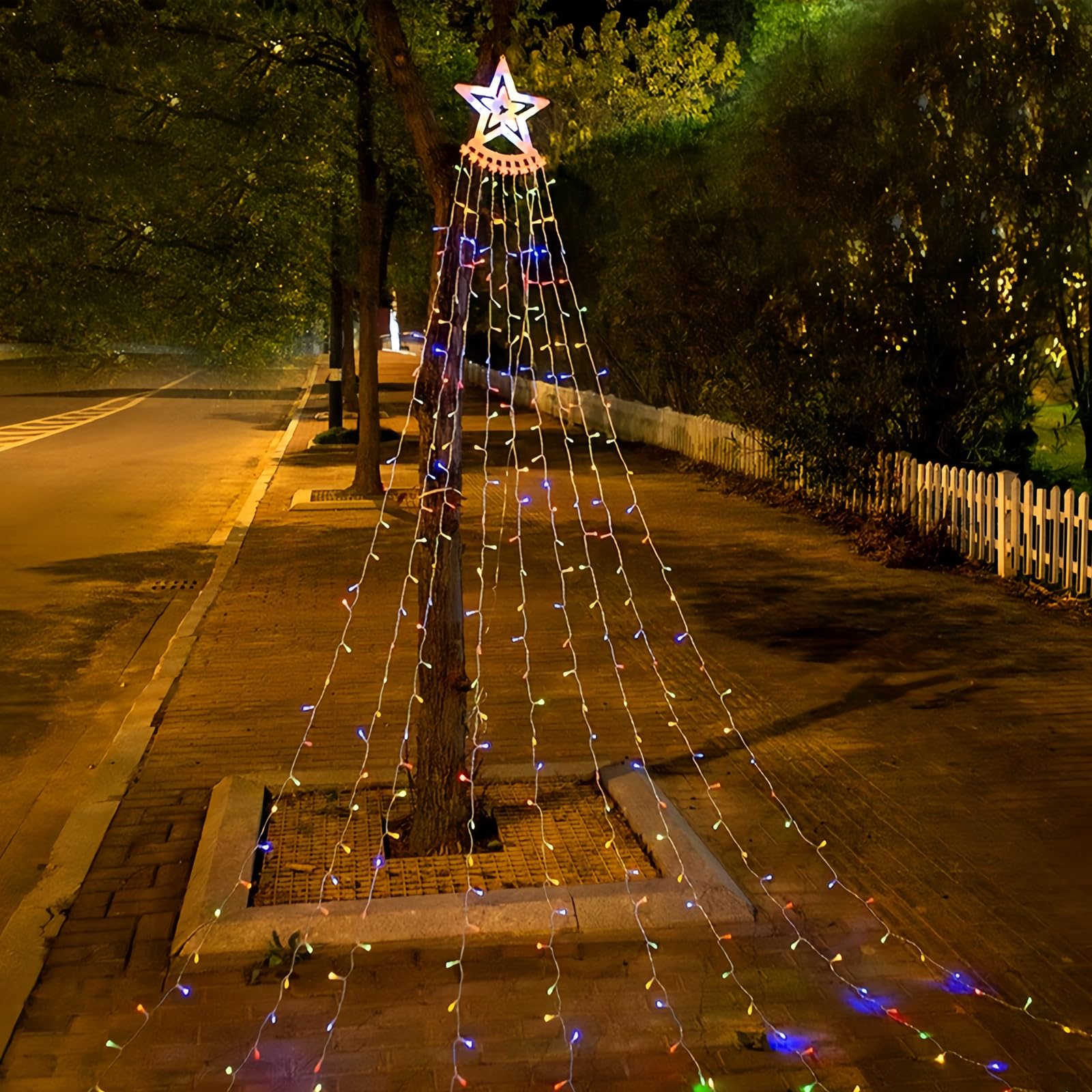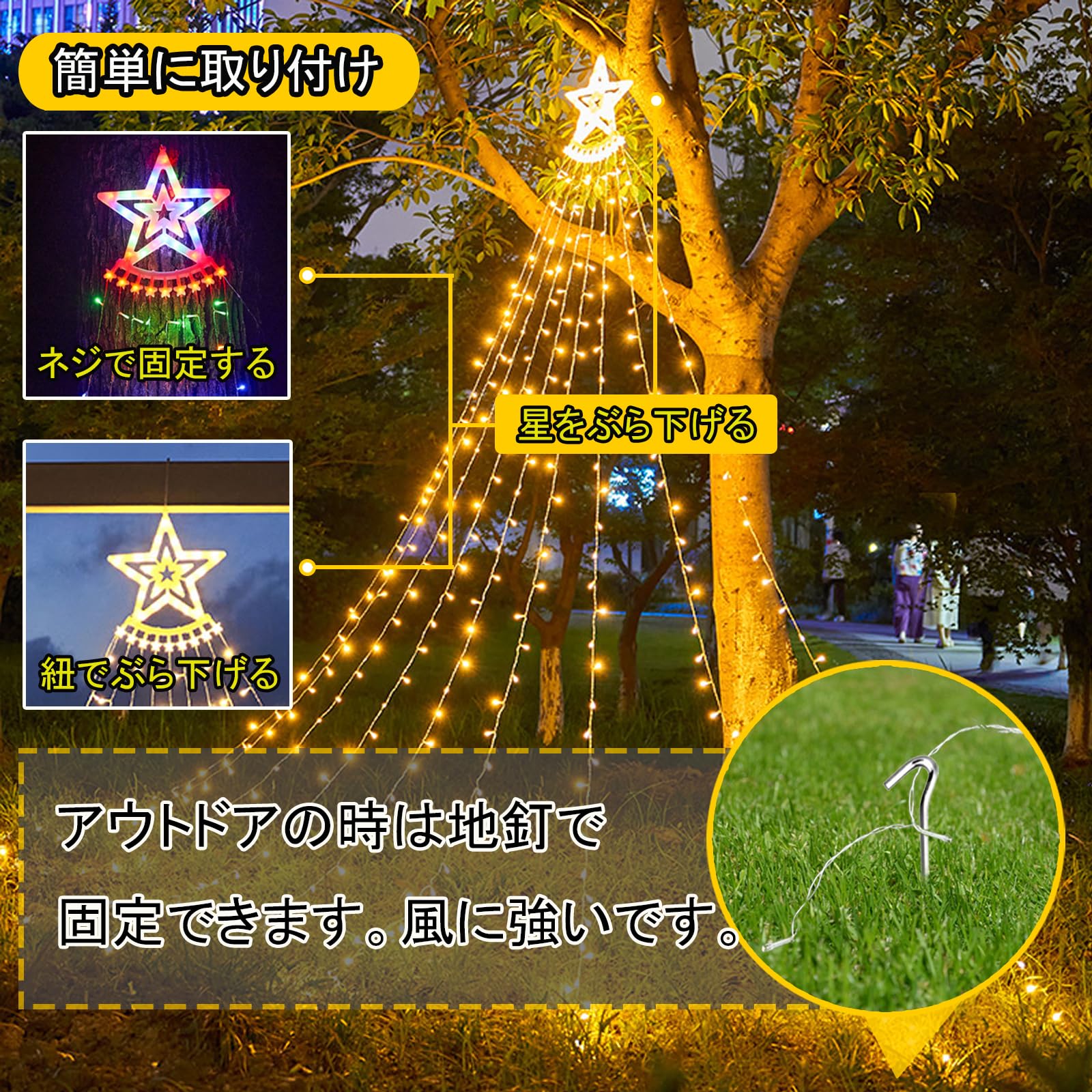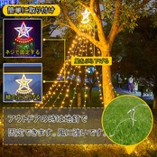 【350個LED&3.5M×9本の大ボリューム】高輝度LED電球を350個搭載し、3.5M×9本のドレープデザインで広範囲を華やかに照らします。先端の大型スターがアクセントになり、ツリーや壁面、バルコニーを一気にクリスマスムードに演出します。