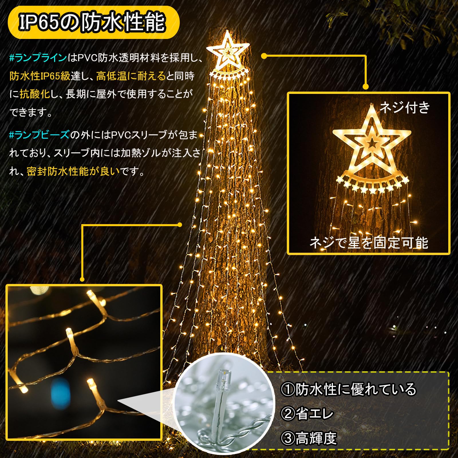 【安定したコンセント式電源で明るく長時間点灯】ソーラー式ではなく、安定した電源を供給できるコンセント式を採用。天候に左右されず、いつでも明るく点灯できます。省エネLED350個がやさしく輝き、屋内外問わず長時間美しいイルミネーションを楽しめます。
