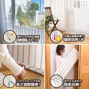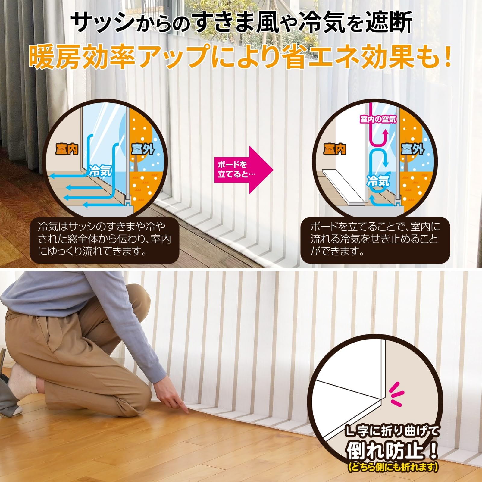 【使い方】下部の切れ目から屋内側に折り曲げて窓に立てかけます。下部を折り曲げる事で全体がフラットに近くなり、直立状態を維持しやすく屋内側に倒れにくくなります。