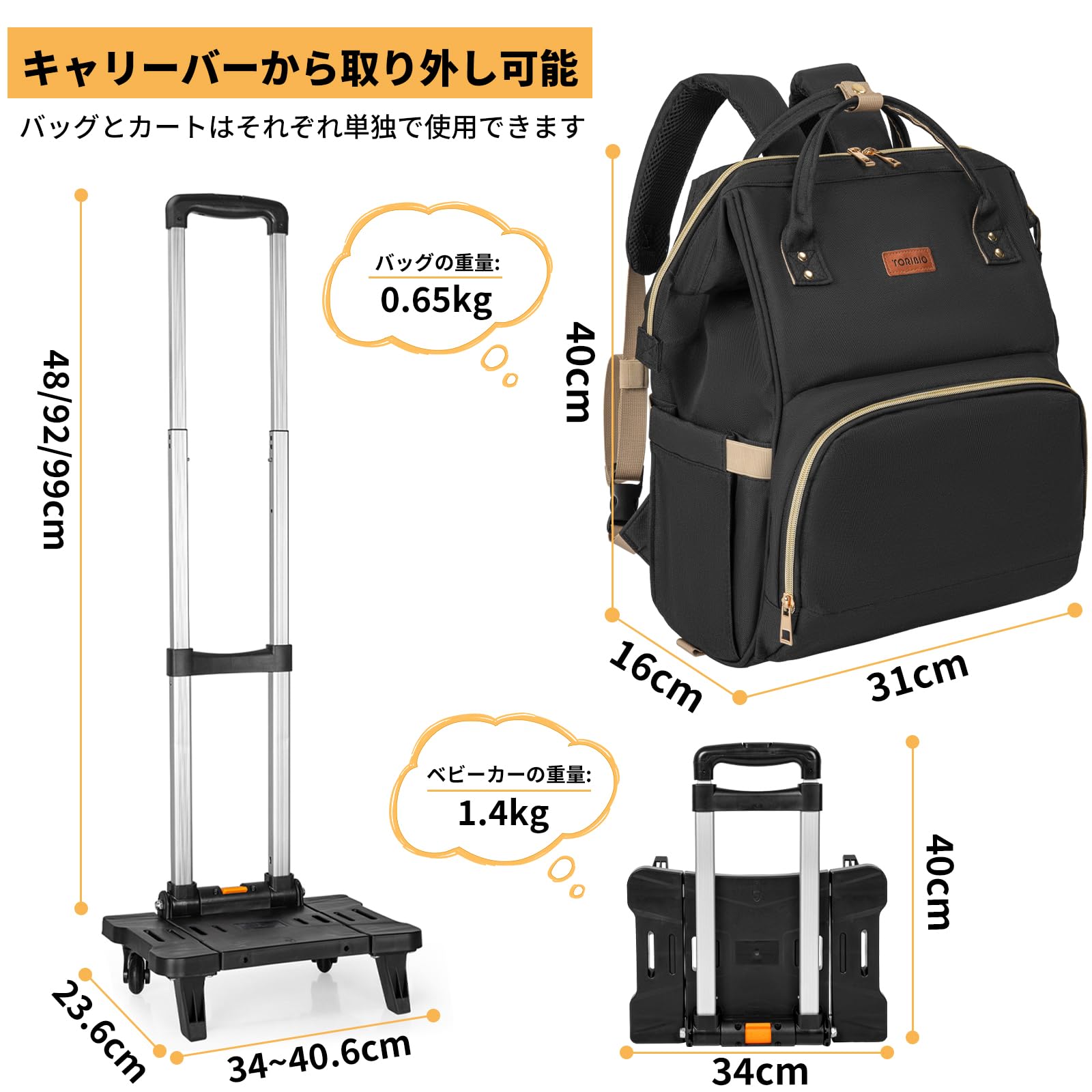 【取り外し可能な2WAYデザイン】 ハンドルと車輪部分が取り外し可能な2WAYデザインを採用しています。必要に応じてカートとしてもバッグとしても使用できるため、様々なシーンで活躍します。組み立ても簡単で、初めて使う時でも迷うことなくセットアップできます バッグは、軽量でありながら非常に丈夫な素材を使用しており、長時間の使用でも疲れにくい設計です。防水加工が施されているため、突然の雨でも安心して使用でき、大切な物品を守ります