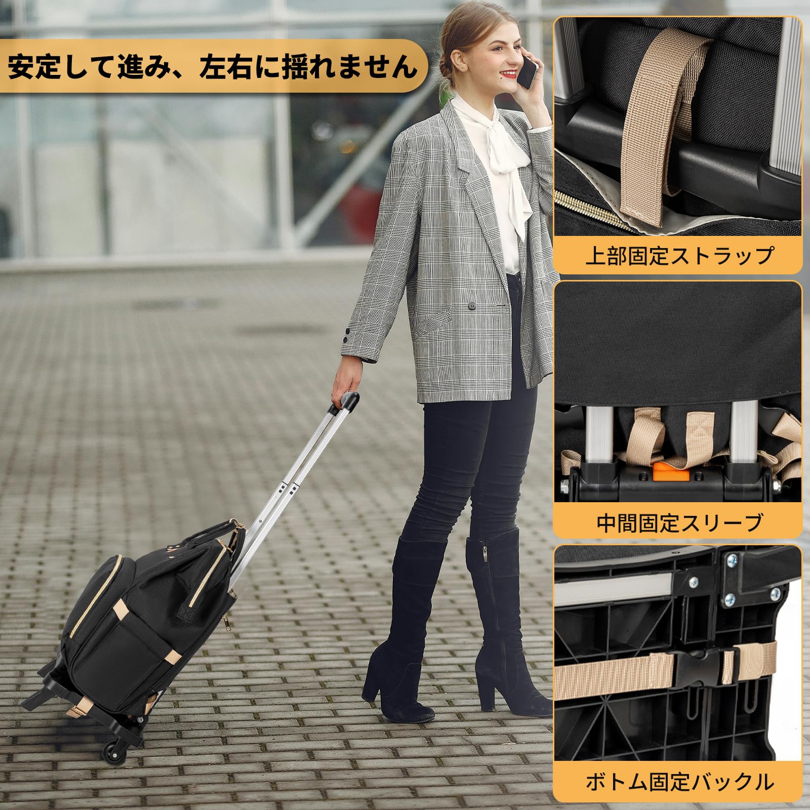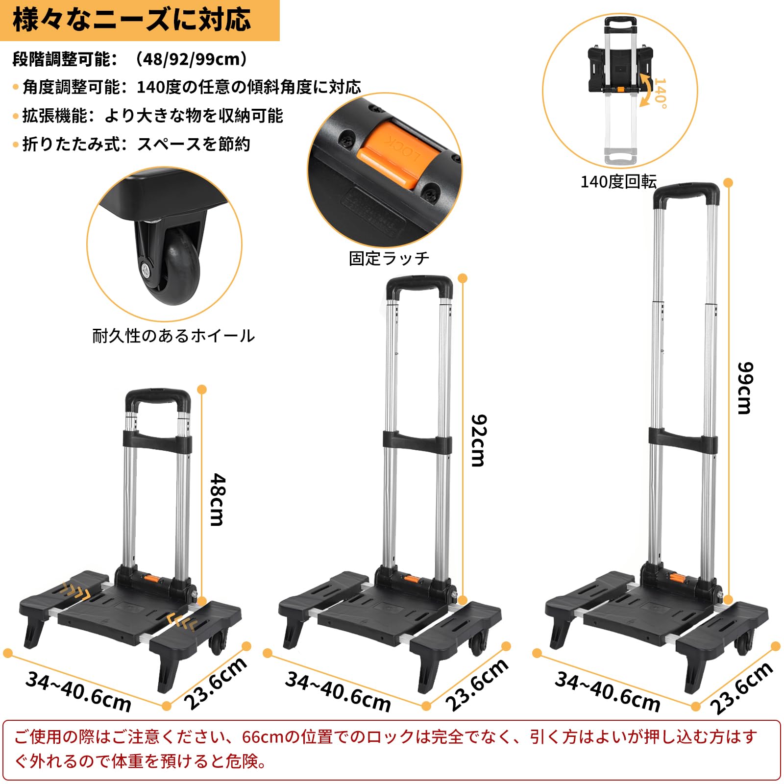 【多機能性】 サイズ:40*31*16cm。出張や旅行時の手間を省き、空港での移動も快適にサポートします。2輪仕様で横押しも可能なため、安定した走行が可能です 2段階の高さ調節が可能なため、使用者の身長や使用シーンに合わせて最適な位置で使用できます。また、ハンドルは180度自由に角度を固定できるので、様々な使い方に柔軟に対応します。さらに、底板が広げられる設計により、収納スペースを増やし、大容量の荷物も楽々収納