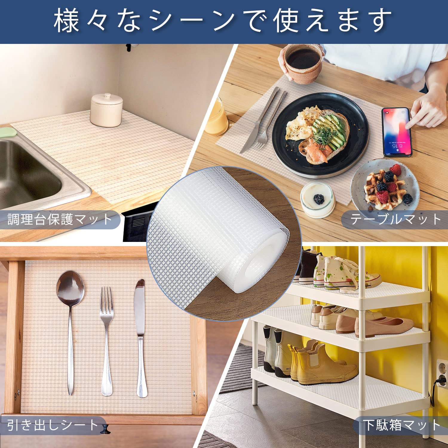 【自由裁断&多用途】食器棚シートは食器棚やカトラリートレイの下に敷いて使います。そして、耐水性に優れており、温度変化にも対応できるため冷蔵庫マットに向いても良いです。それだけでなく、台所、引出し、テーブル、棚、シェルフライナー、ワードローブ、本棚、化粧台、キッチンカウンター、キャビネット、シューズラックにも適用です。使用場所に合わせてハサミで簡単にカットすることができます。スクラップが残っている場合は、それらをコースター、プレースマットにカットし、環境的に使用できます。