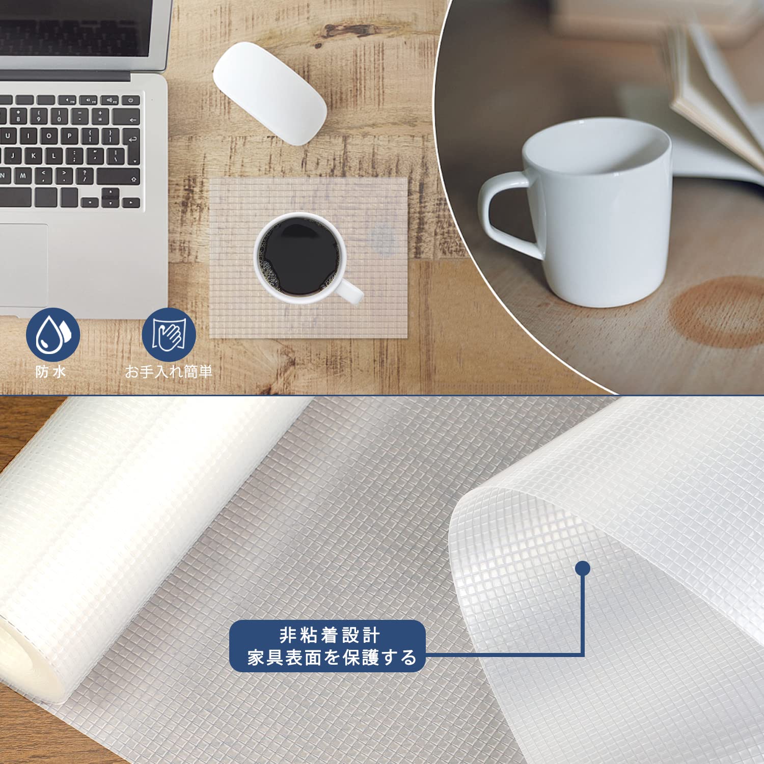 【滑り止め機能】キッチンシートの片面は方眼の滑り止めデザインが摩擦を強化することで品物は意外に滑るのを防ぎ、家具の傷を減らします。食器の出し入れの際などにクロスがズレたり、シワが寄るのを防ぎま、大切な食器をやさしく守ります。