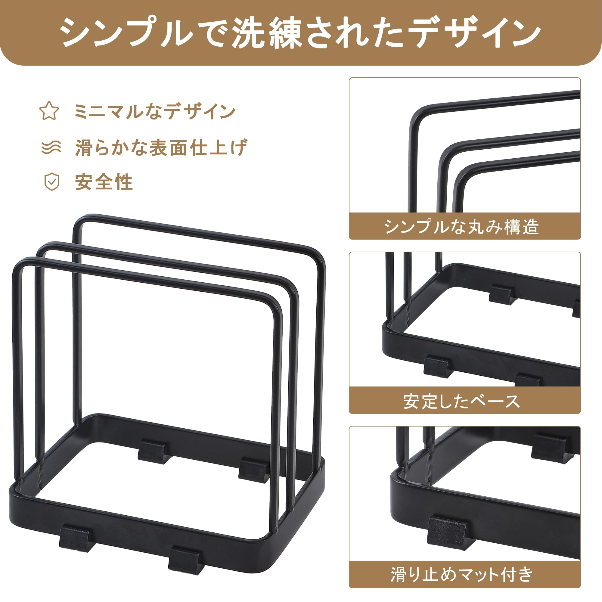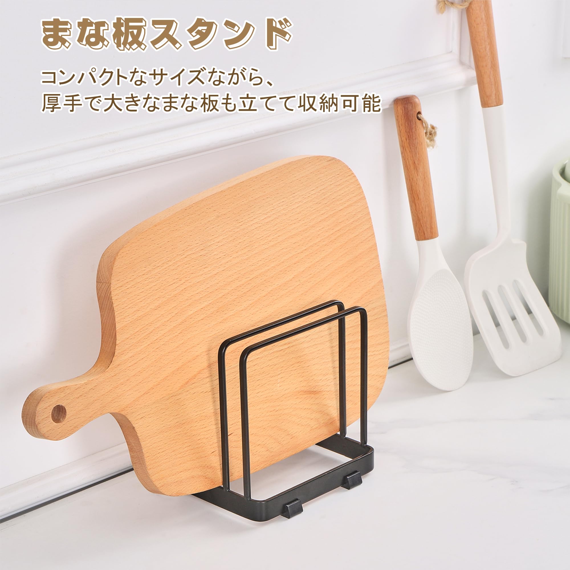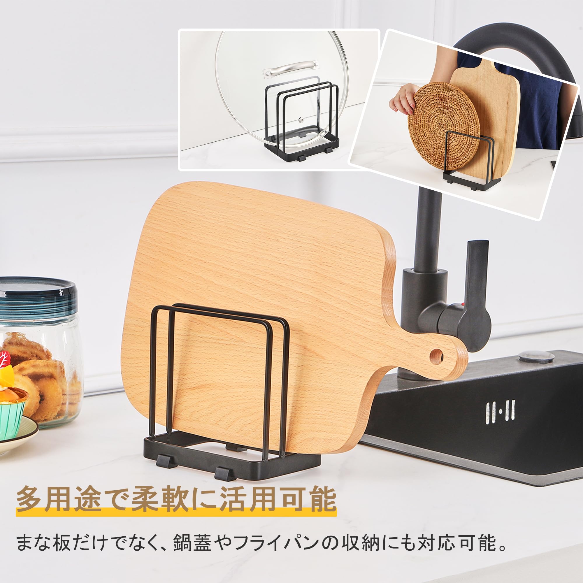 【多用途で柔軟に活用可能】まな板だけでなく、鍋蓋やフライパンの収納にも対応可能。さらに、キッチンクロスや小型の調理器具を干すこともできます。一つのスタンドで複数の用途をこなすため、キッチン整理がより簡単になります。また、用途に応じて異なるサイズの器具を効率よく収納できるフレキシブルなデザインが魅力です。