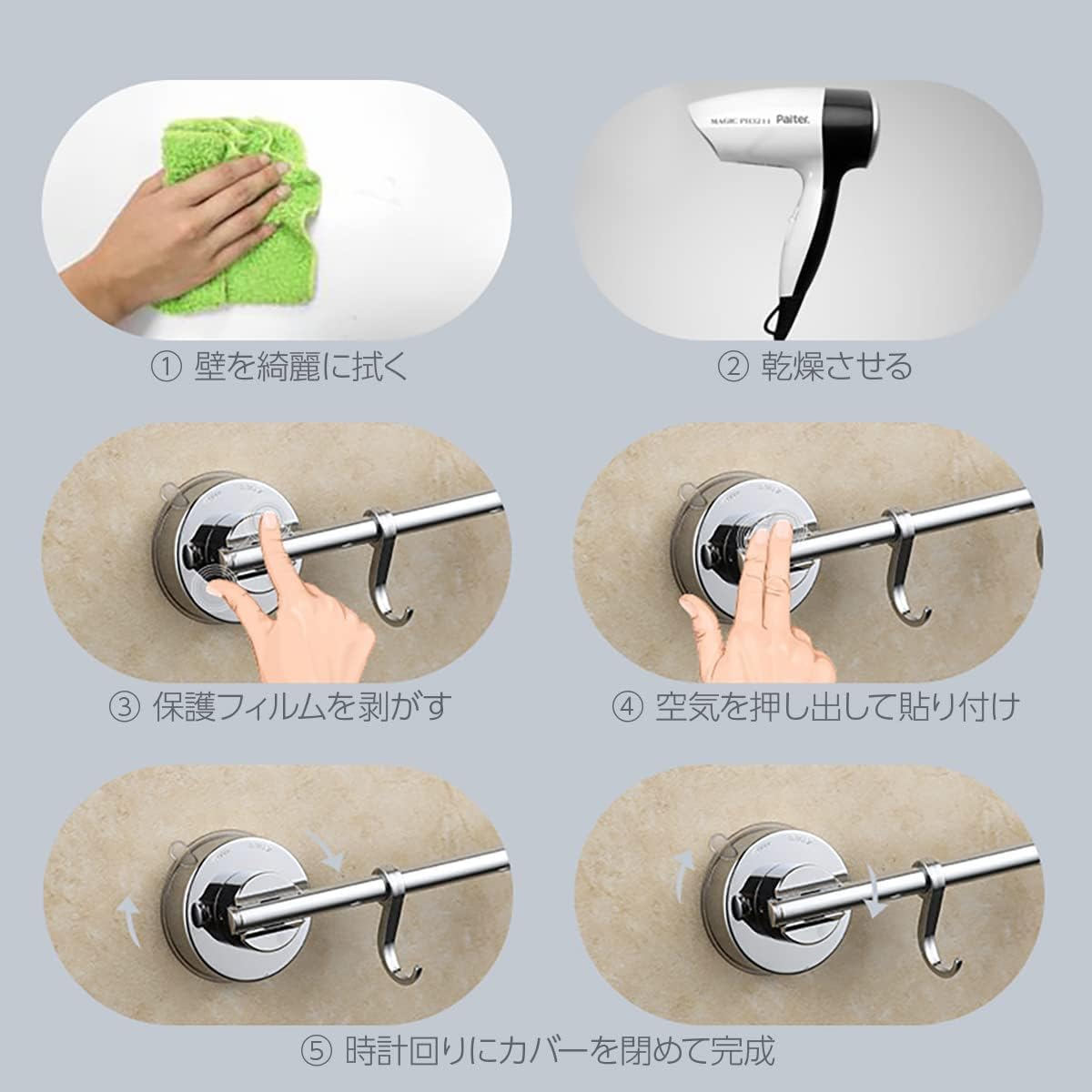【取付方法】①壁を綺麗に拭き乾かします。?付いている保護フィルムを剥がし、壁面に貼付けます(この時にしっかり空気を押し出してください)?時計回りにカバーを閉め取りつけ完了。