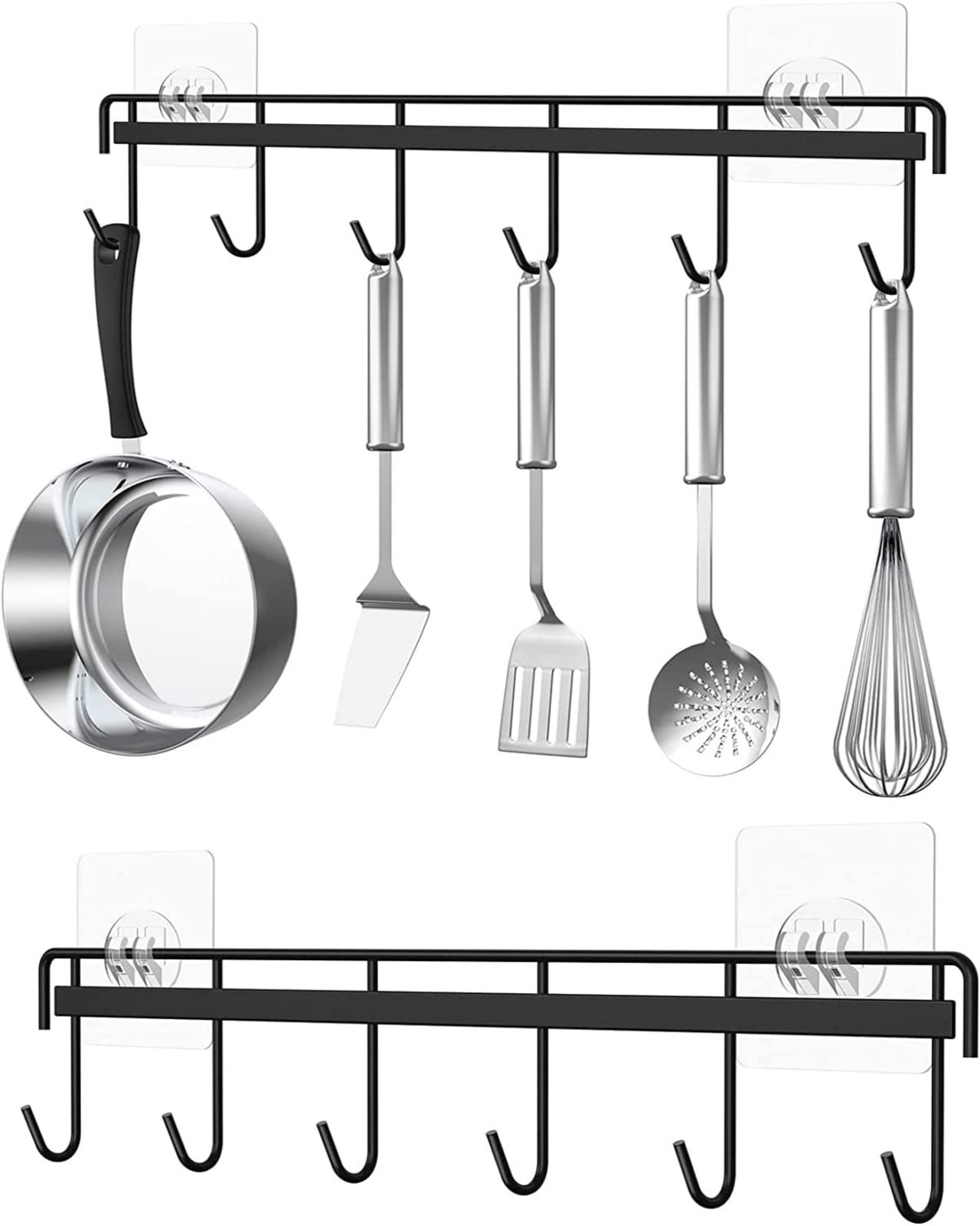 DOIOWN キッチンツールフック 強力粘着式 穴あけ不要 壁掛けフック ステンレス製 キッチン収納 防水仕様 6フック付属 幅32cm 2個セット(補助テープ4枚付き)