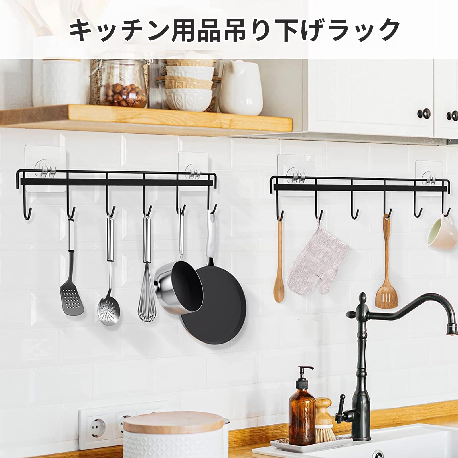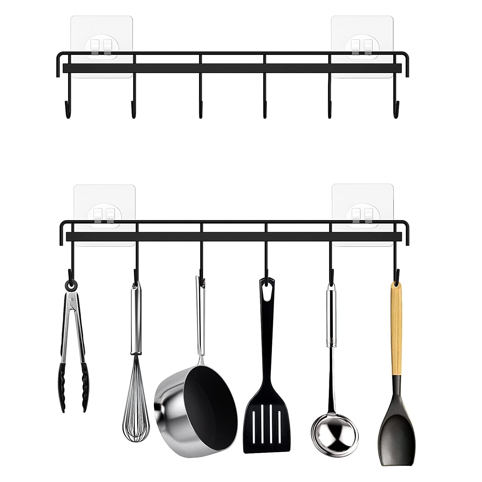 【キッチンツールフック】サイズ:32.5 x 6.5 x 2 cm、重量:約112 g、材質:鉄、数量:キッチンツールフック1個、粘着フック2個。 この壁掛けフックで収納スペースを節約できます。 各棚には6つのフックがあり、キッチンツールを掛けられます。