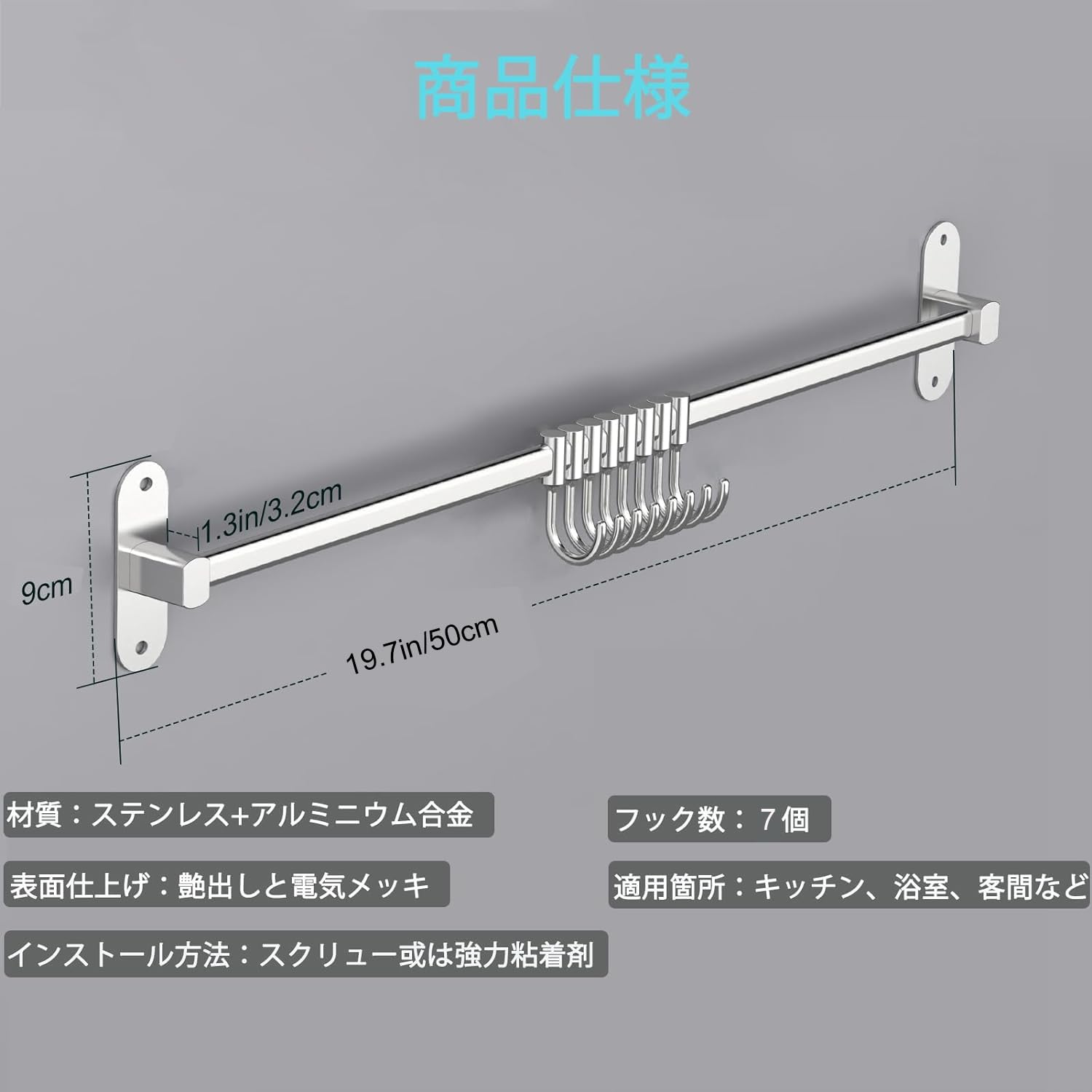 ☆ キッチンツールフック本体サイズ:50×9cm; 重量:310g; 材質:ステンレス; 移動可能なフック*7個; インストール手順説明*1 ; 粘着剤*1; 補助テープ *1; ネジ*1パック. ★万一初期不良・使用中の自然故障等で製品がご利用頂けなくなった場合は、いつでもお気軽にご連絡ください。