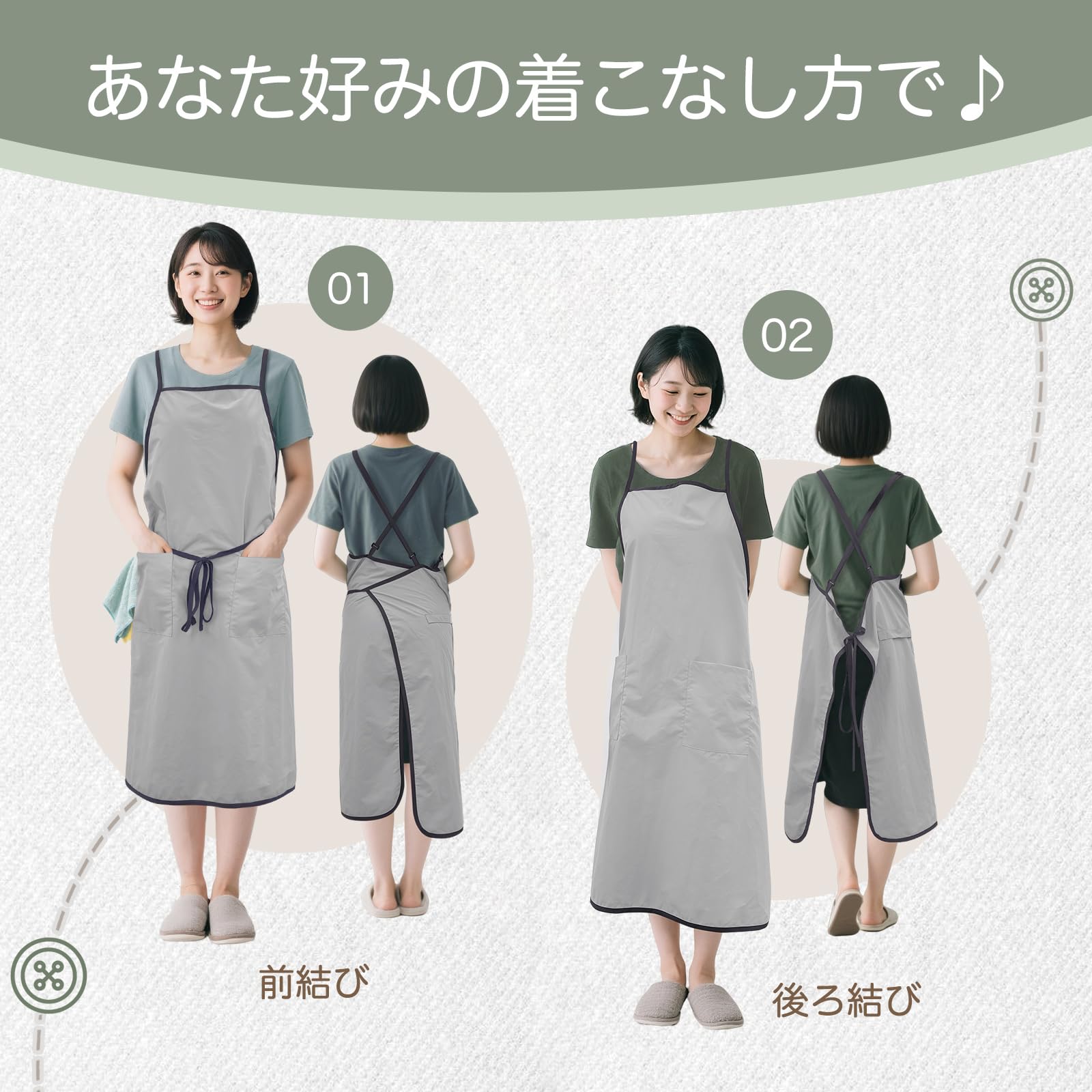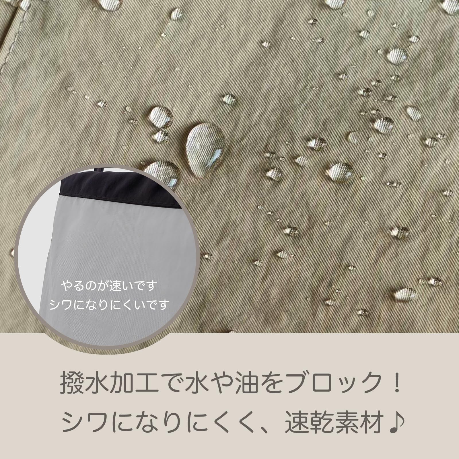 【防水速乾・しわになりにくい】水や油を弾く撥水加工生地を使用。軽量で乾きやすく、しわになりにくいのでお手入れも簡単。毎日の家事や仕事を快適に。