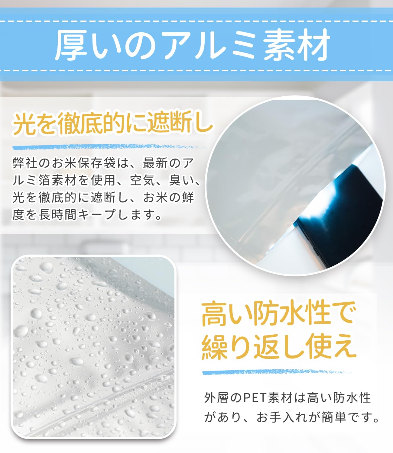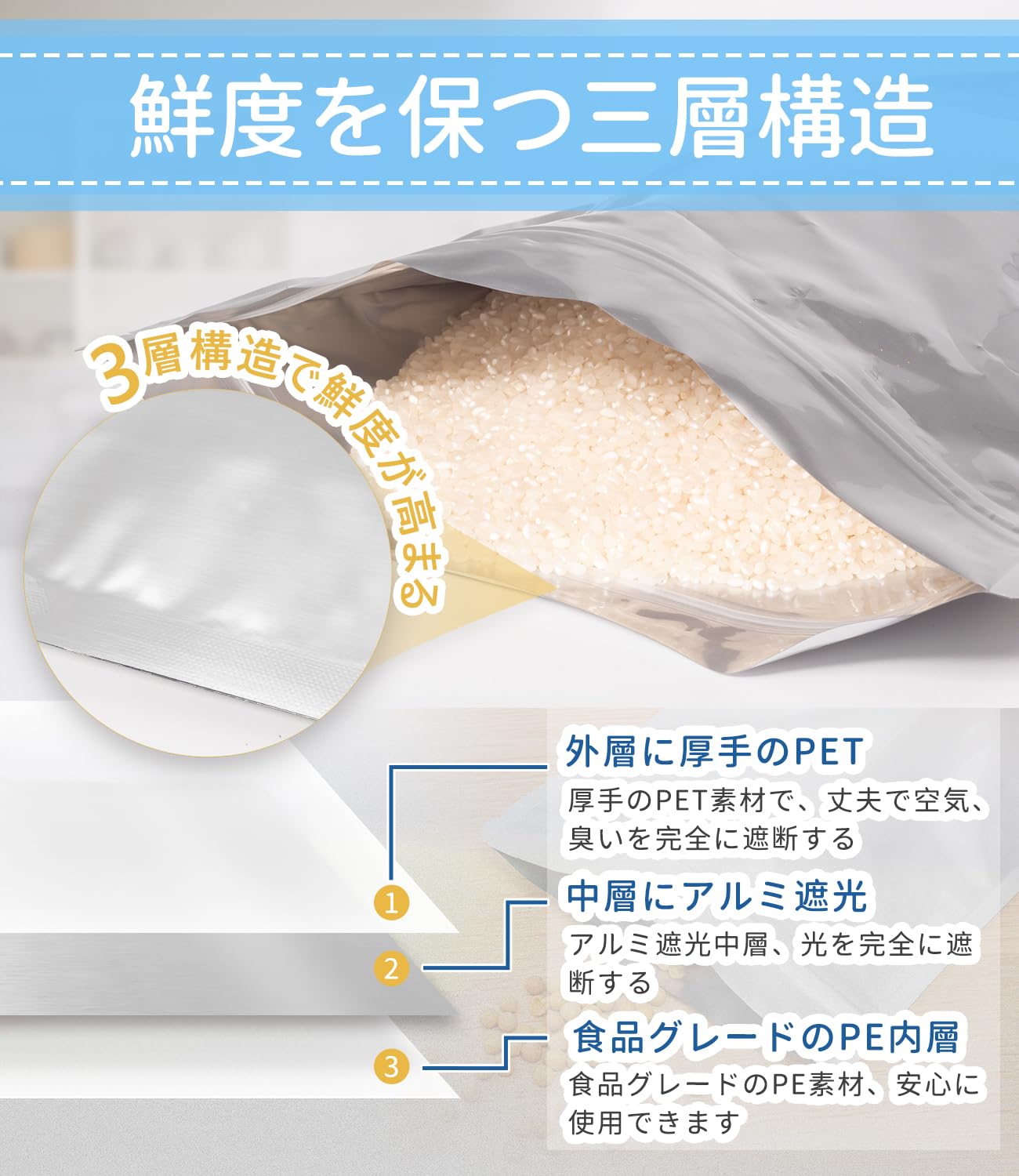 【厚手の3層構造で鮮度が高まる】このお米保存袋は、食品対応のアルミのジップ付き袋です。丈夫な素材なので、外層にPET、中層にアルミ、内層にPEの三層構造で空気を通さず、光や臭いをしっかり遮断し長持ちさせる。湿気て虫の心配もいらないので安心して使用できます。