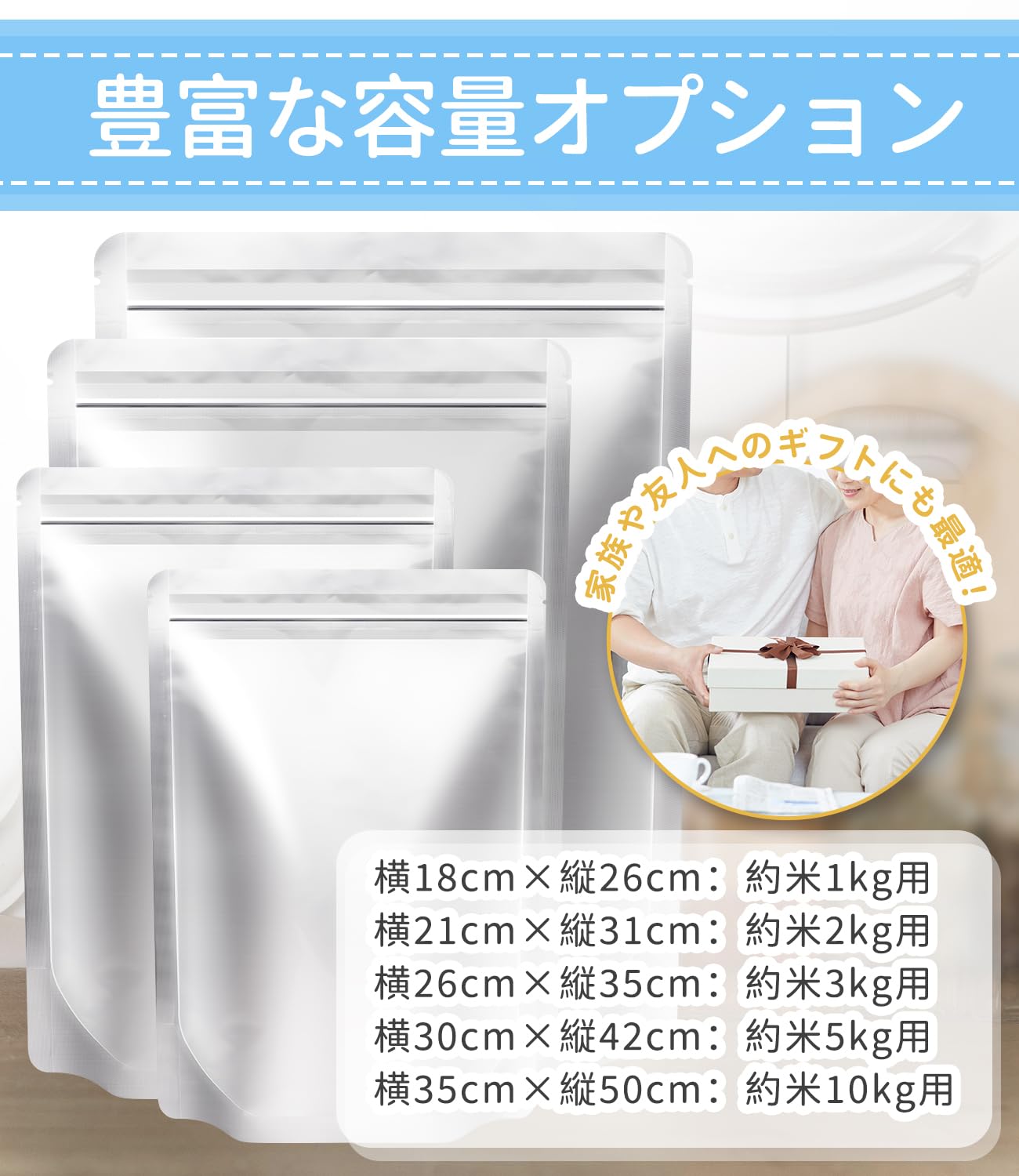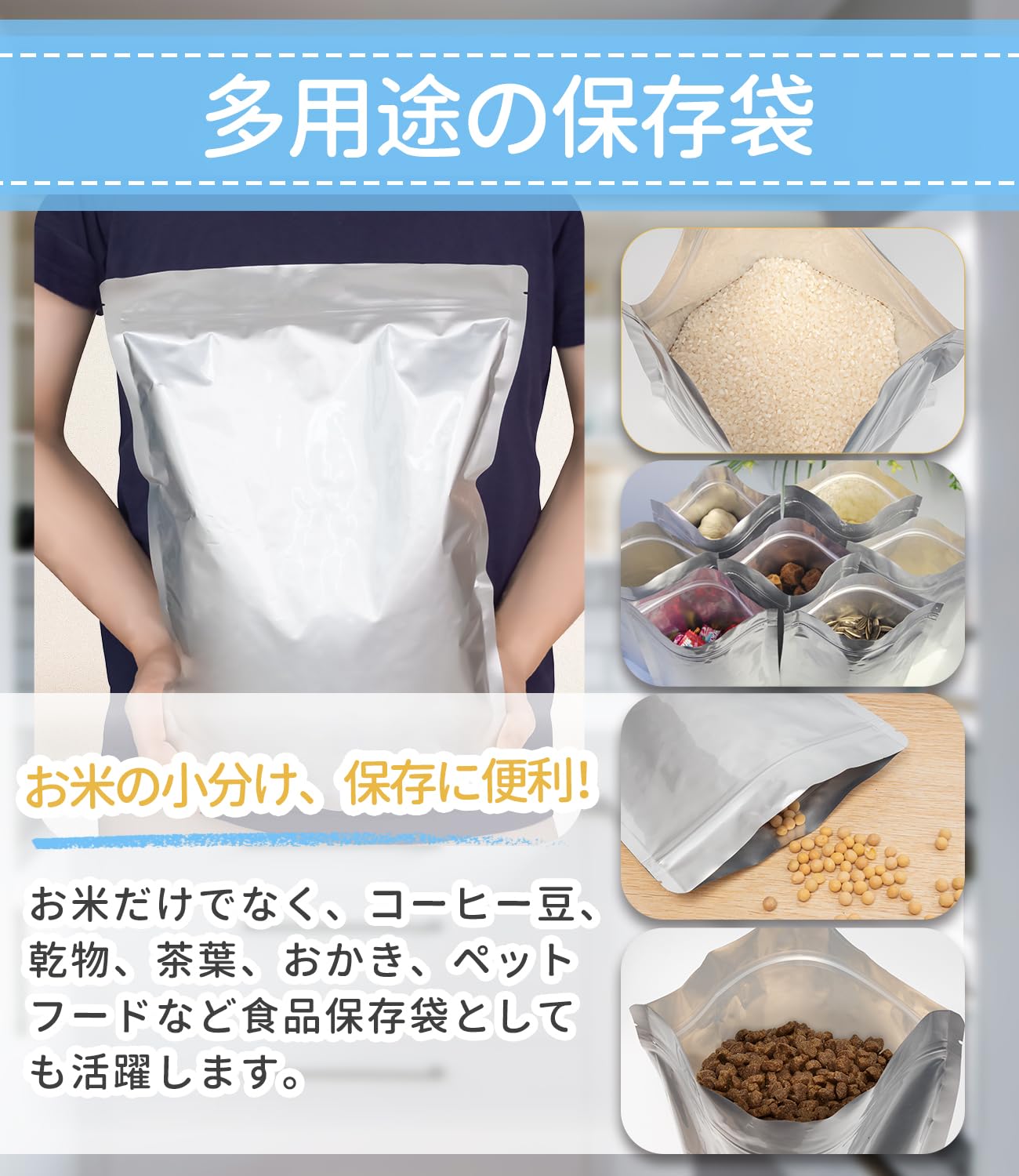 【多用途、贈り物にも】お米の保管に!お米だけでなく、使いかけの乾麺や食べかけのスナック菓子の保管にもいいですよ。コーヒー豆、乾物、茶葉、おかき、ペットフードなど食品保存袋としても活躍します。お米に限らず食品全般の保存・災害用品の保存にも最適だます。家族や友人へのギフトにも最適。