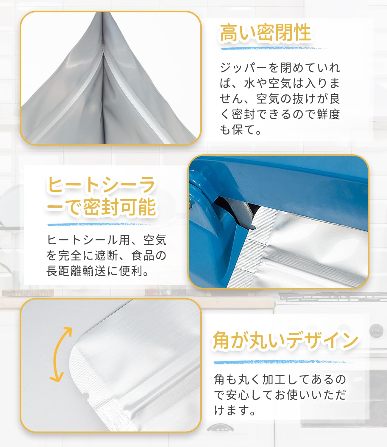 【ヒートシール用、角が丸いデザイン】ジッパー上部には十分な幅があるので、ヒートシーラーも使える、切れ込みが入っているのでハサミなしでも開けます。空気を完全に遮断、食品の長距離輸送に便利。角も丸く加工してあるので安心してお使いいただけます。
