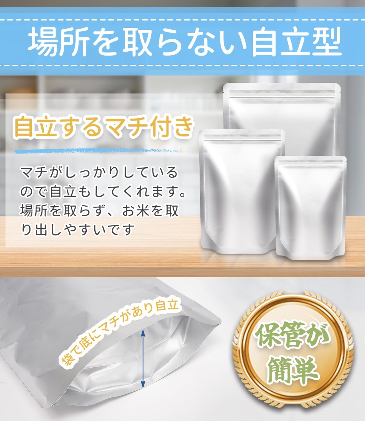 【自立型で場所を取らない】マチがしっかりしているので自立もしてくれます。縦置き横置きどちらでも収納できます。場所を取らず、お米を取り出しやすいです。保管箱より使いがって良く必要な時小分けできます。冷蔵庫の中に入れて保管できるです。