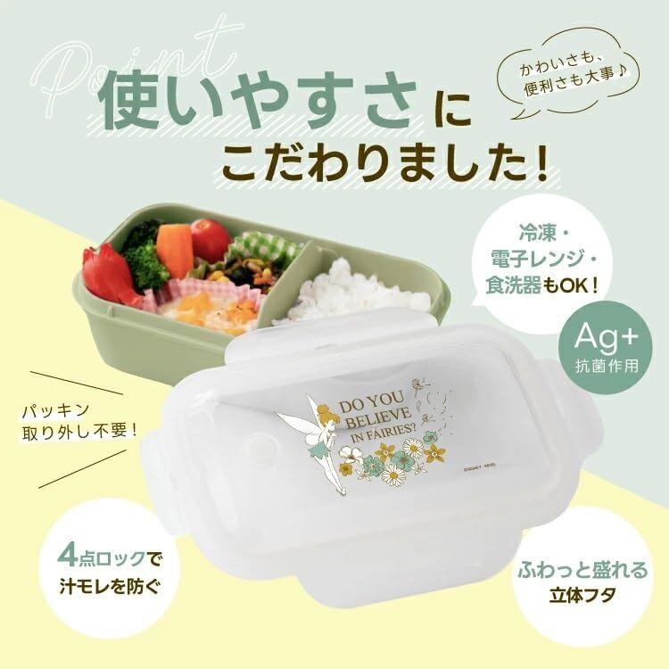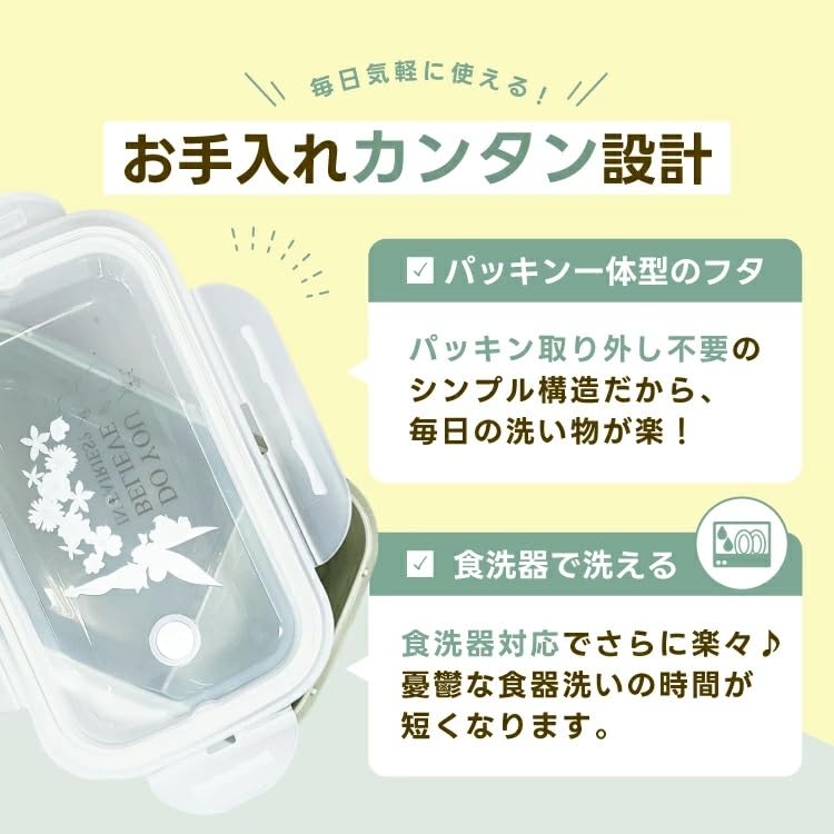 4点ロックで汁漏れを防ぐ。パッキン取り外し不要でお手入れ簡単。抗菌加工、電子レンジ対応、冷凍保存可、食洗器OK