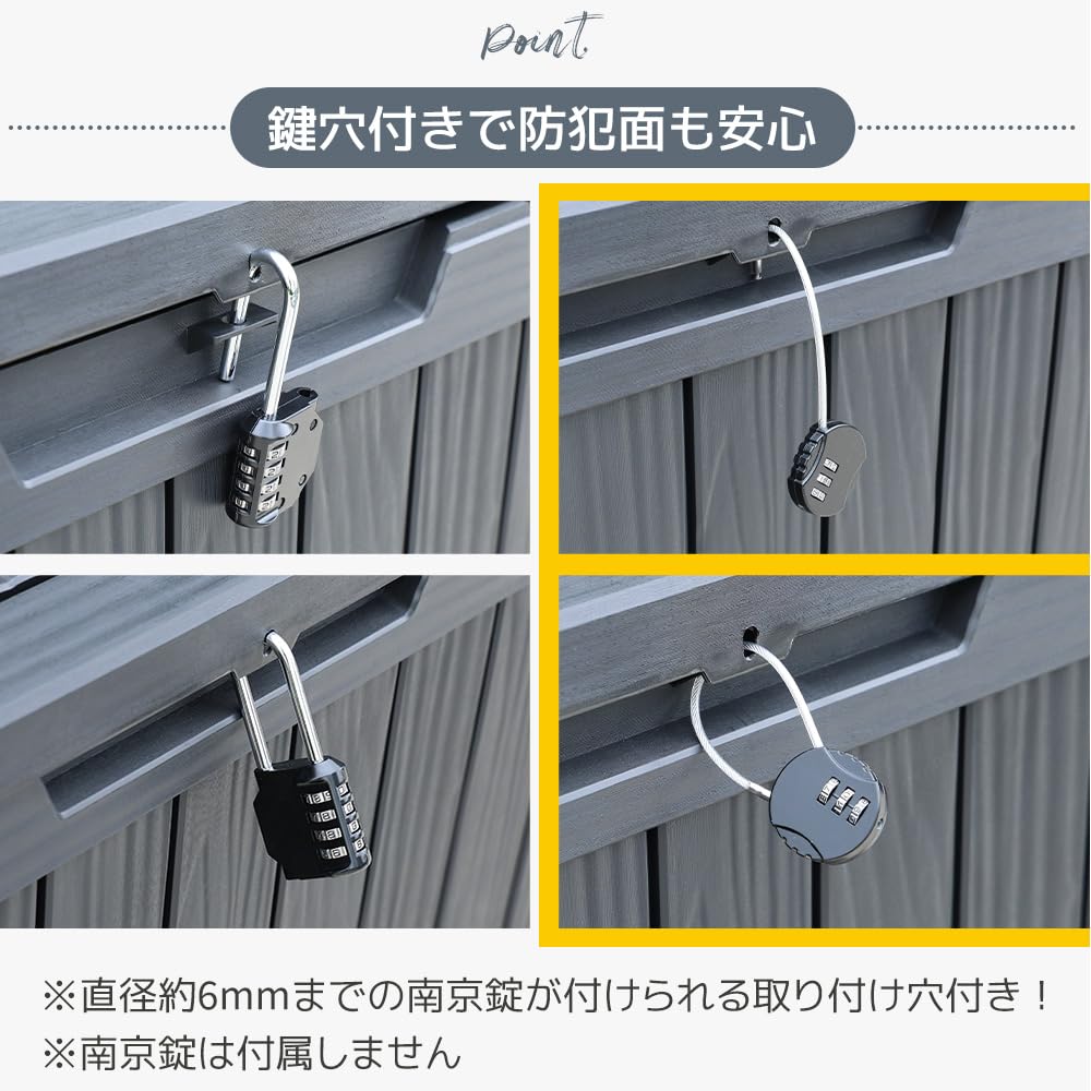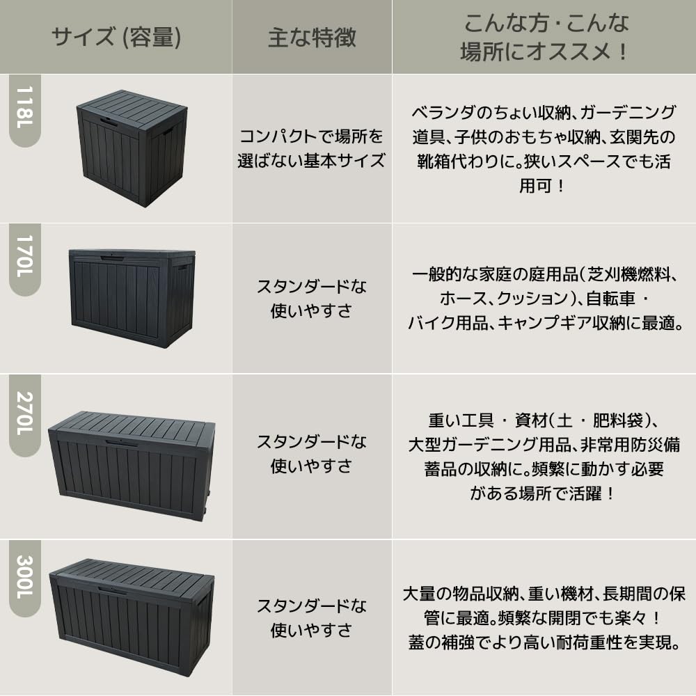 【ご用途に合わせて選べる4サイズ】118L--コンパクトで場所を選ばない基本サイズ--ベランダのちょい収納、ガーデニング道具、子供のおもちゃ収納、玄関先の靴箱代わりに。狭いスペースでも活用可!170L--スタンダードな使いやすさ--一般的な家庭の庭用品(芝刈機燃料、ホース、クッション)、自転車・バイク用品、キャンプギア収納に最適。270L--スタンダードな使いやすさ--重い工具・資材(土・肥料袋)、大型ガーデニング用品、非常用防災備蓄品の収納に。頻繁に動かす必要がある場所で活躍!300L--スタンダードな使いやすさ--大量の物品収納、重い機材、長期間の保管に最適。頻繁な開閉でも楽々!蓋の補強でより高い耐荷重性を実現。