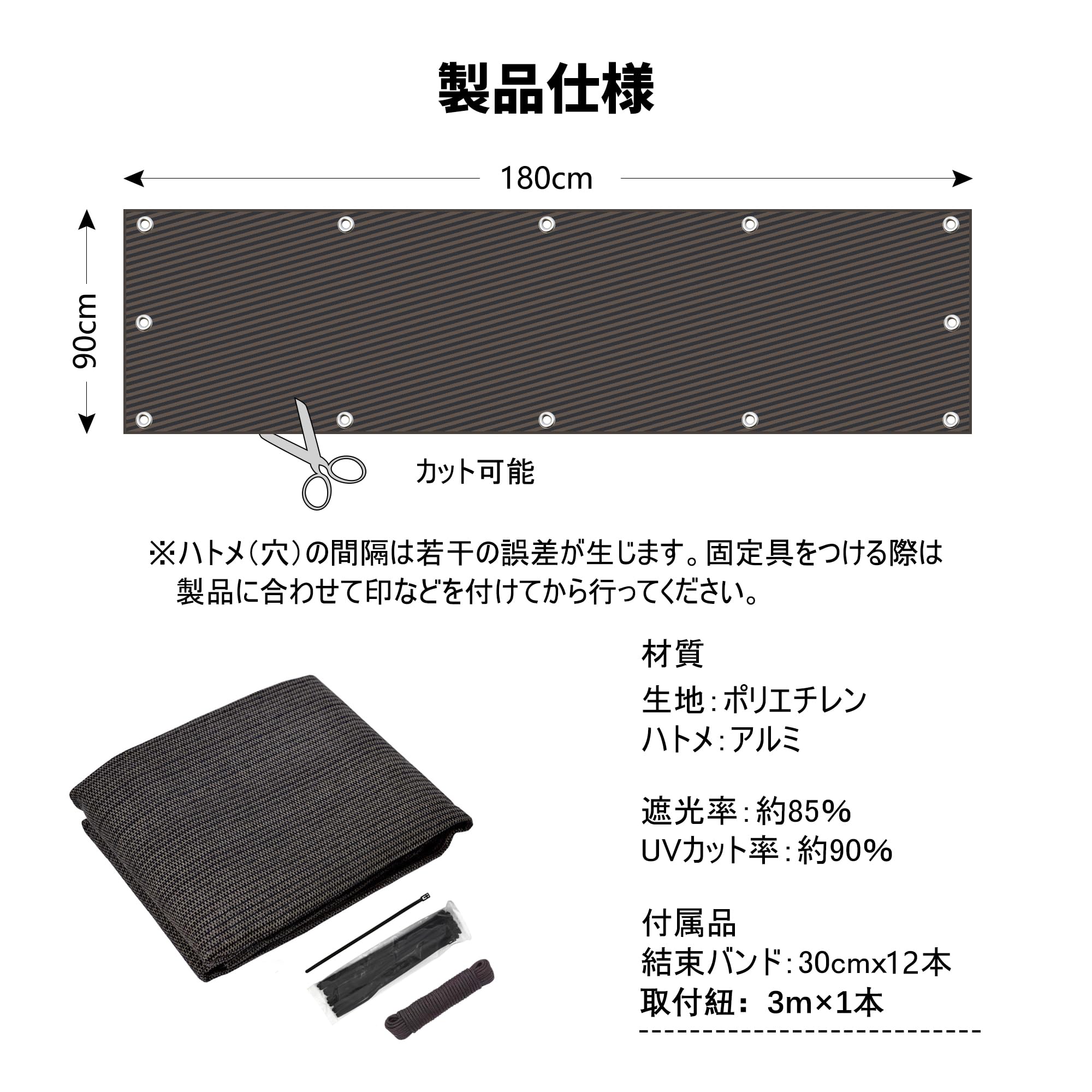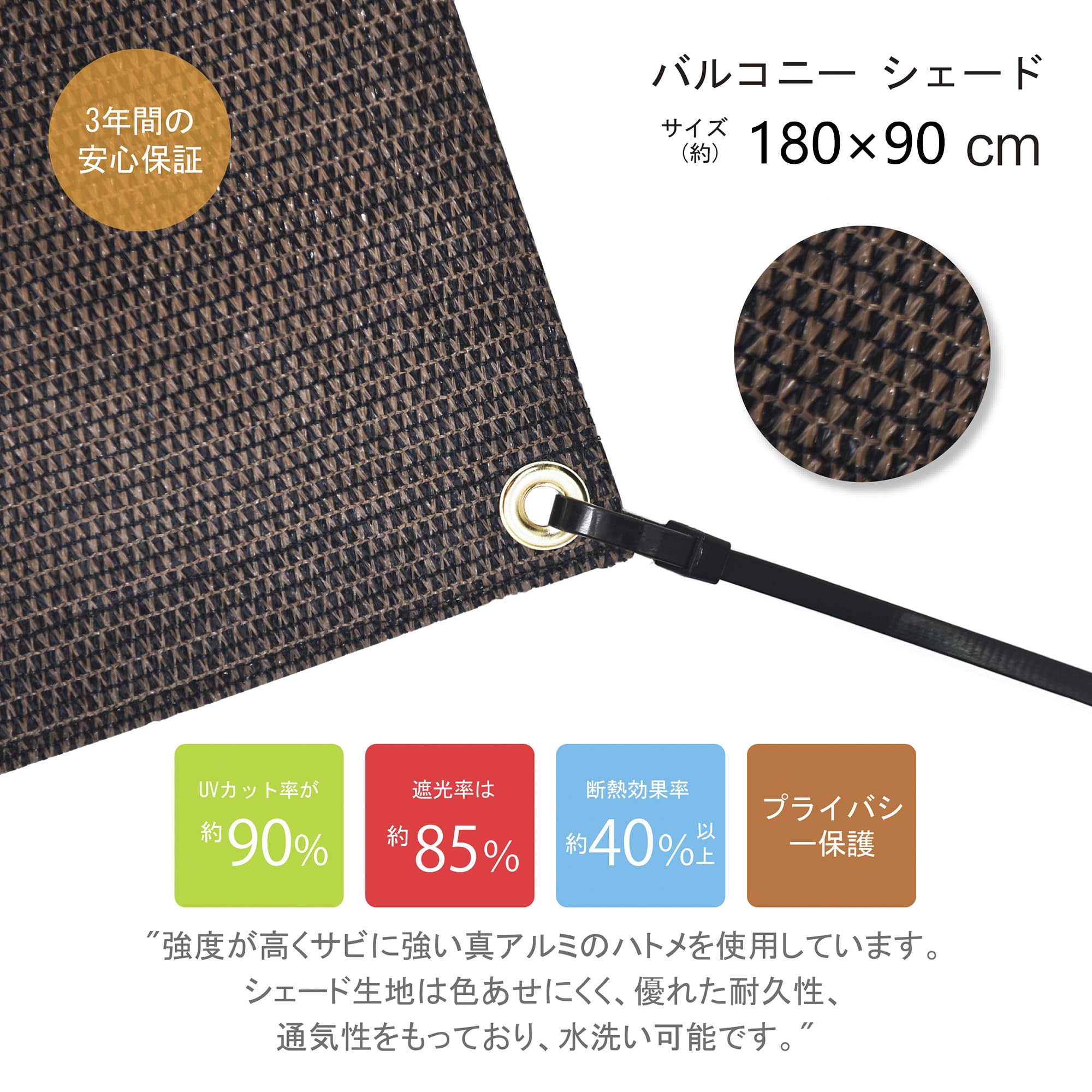 紫外線UVカット率が90%以上,遮光率は約85%。紫外線に強い、色褪せや紫外線劣化に強い糸で織られた生地を使用。