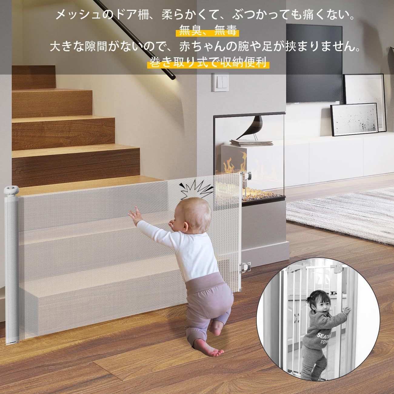 ?赤ちゃんやペットの健康と安全を守り ママの介護をより楽にする?:赤ちゃんを介護に専用に設計されたゲートですので、母親は赤ちゃんの介護するのがより手間を省くことができます:?家で掃除するとき、この赤ちゃん用 ドア柵で寝室に遮って、子供の邪魔を防ぐことができます。?キッチンで料理をするとき、このメッシュ布ゲートを利用して子供を台所の外に遮ることができてます。?子供やペットが病気で隔離する必要がある場合、このドアバーでペットと子供の遮断をして接触を防ぐことができます。?階段口や入り口にドア柵を設置し、大人の介護が不便なときに子供が一人で階段を登ったり、ドアの外に出たりするのを防ぐことができます。?トイレにドア柵を設置し、子供やペットが不衛生なものに接触するのを防ぐ。子供とペットの健康を守ります。