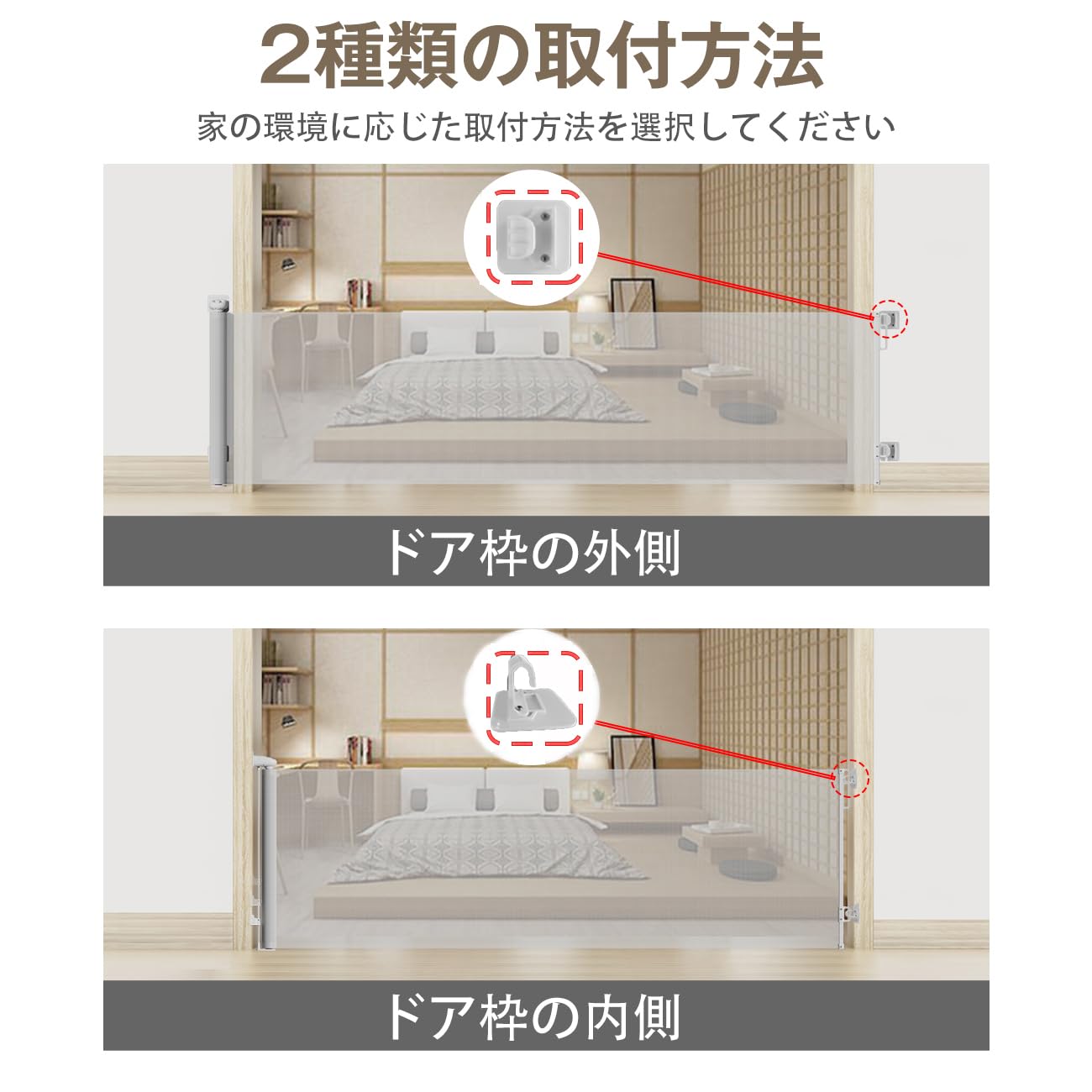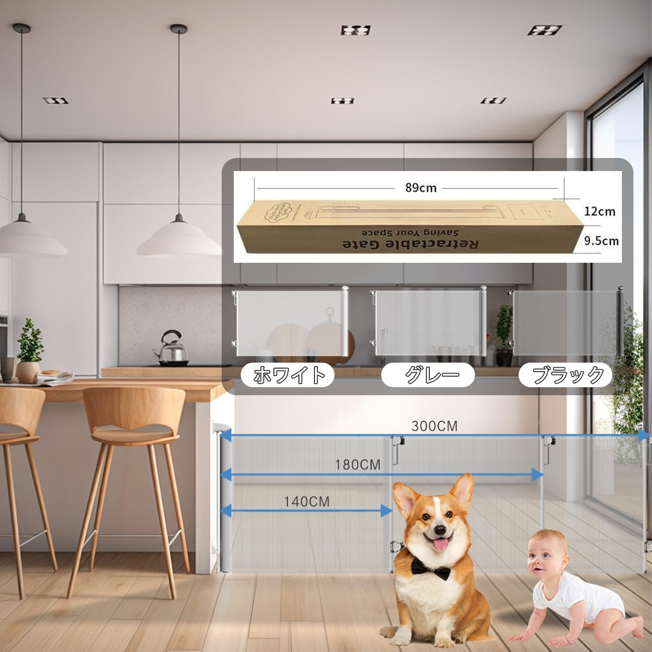 ?巻き取り式デザインベビーゲート 色々なドア横幅兼用?:この格納式ベビーゲートが、使用する必要がない時、収納が便利で省スペースです。リール伸縮設計により、様々なサイズのドアフレーム(幅140CMまで)に対応でき、ベビーフェンスのサイズの不適切さが使用に影響する悩みはありません。フックタイプ接続とメッシュ式ドアバーのデザインにより、片手でメッシュのドア柵を開けって使用できます。 ご家には乳幼児或いは犬猫などの小さなペットがいる場合は、このベビーズゲートがぜひお勧めの商品です。兼用ドア横幅サイズ参考:片開きタイプドア(3尺系)横幅740mm/親子ドア(4.5尺系)1190mm。