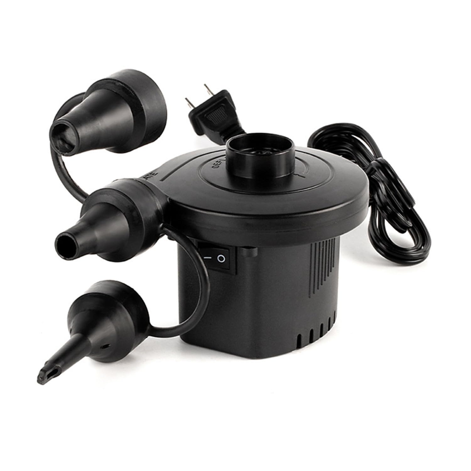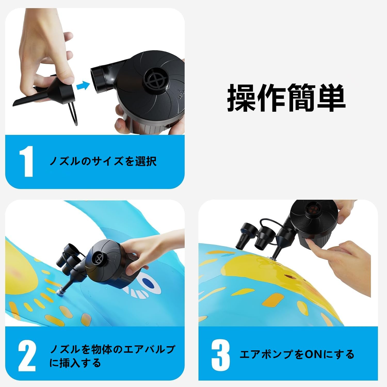 『空気を入れる』:1.空気を入れる側のパルプに合わせてノズルを選び、電動ポンプ本体の空気吹き出し口に専用ノズルを差し込む。2.電源プラグをコンセントに差し込む。 3.スイッチの「I」を押すと、操作が始まります。『空気を抜く』:1.空気を抜く側のパルプに合わせてノズルを選び、電動ポンプ本体の空気吸い込む口に専用ノズルを差し込む。2.電源プラグをコンセントに差し込む。 3.スイッチの「I」を押すと、操作が始まります。