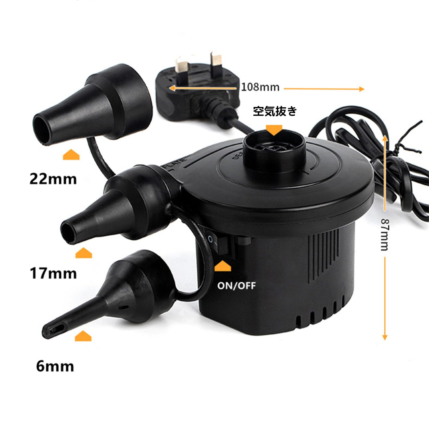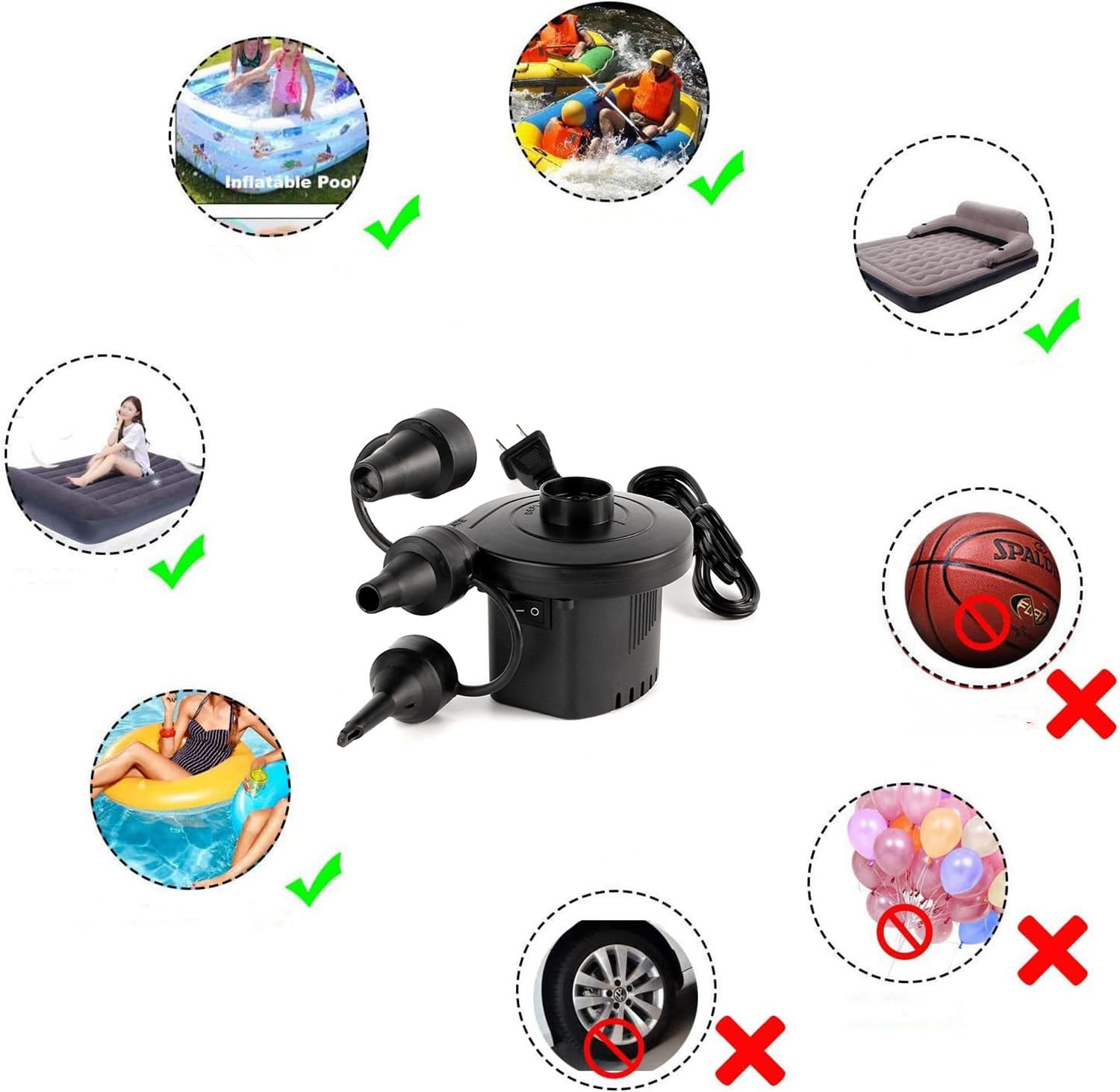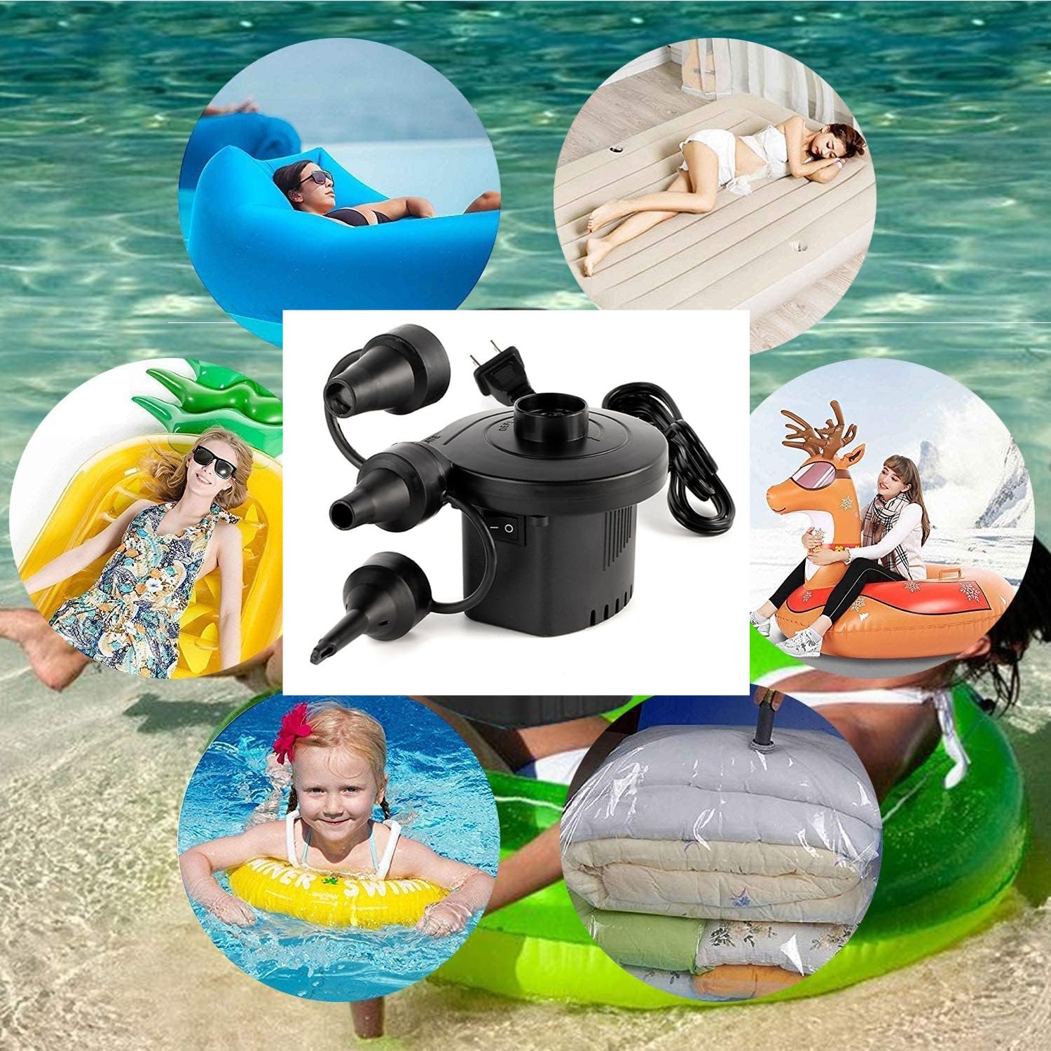 【多機能対応】この電動エアーポンプは、浮き輪、ゴムボート、エアベッド、ビニールプールなど、さまざまなエアアイテムに対応。キャンプやアウトドアでも大活躍です。また、布団や衣替えの真空収納にもお役に立ちます。※ご注意:風船、バスケットボールや自転車には適用されません。