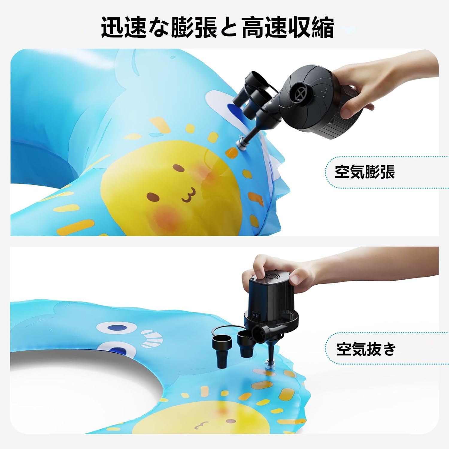 【給気&排気両対応】空気入れと空気抜きの両方に対応し、スイッチ一つで簡単に操作できるので、手間なく素早くエアアイテムを準備できます。※ご注意:10分以上の連続運転はしないでください。特に夏の気温が高くて、長時間の作業で過熱による故障する恐れがあります。