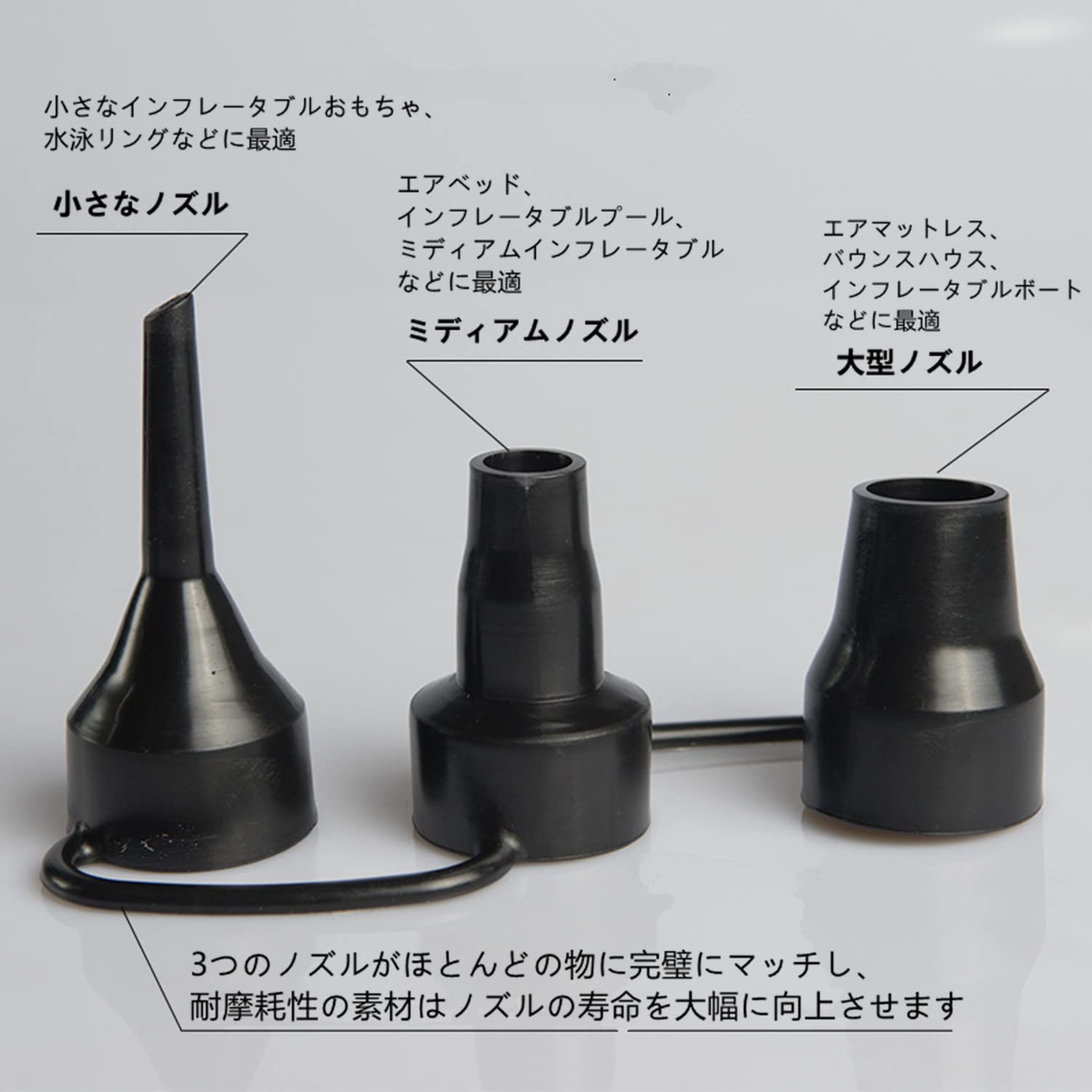【3種類のノズル付き】 小・中・大の3種類のノズルが付属しており、サイズや空気穴の大きさが違っても対応できるため、幅広いアイテムに使用可能です。用途に応じて使い分けできる3種類のノズルが付属しており、さまざまなバルブに対応します。
