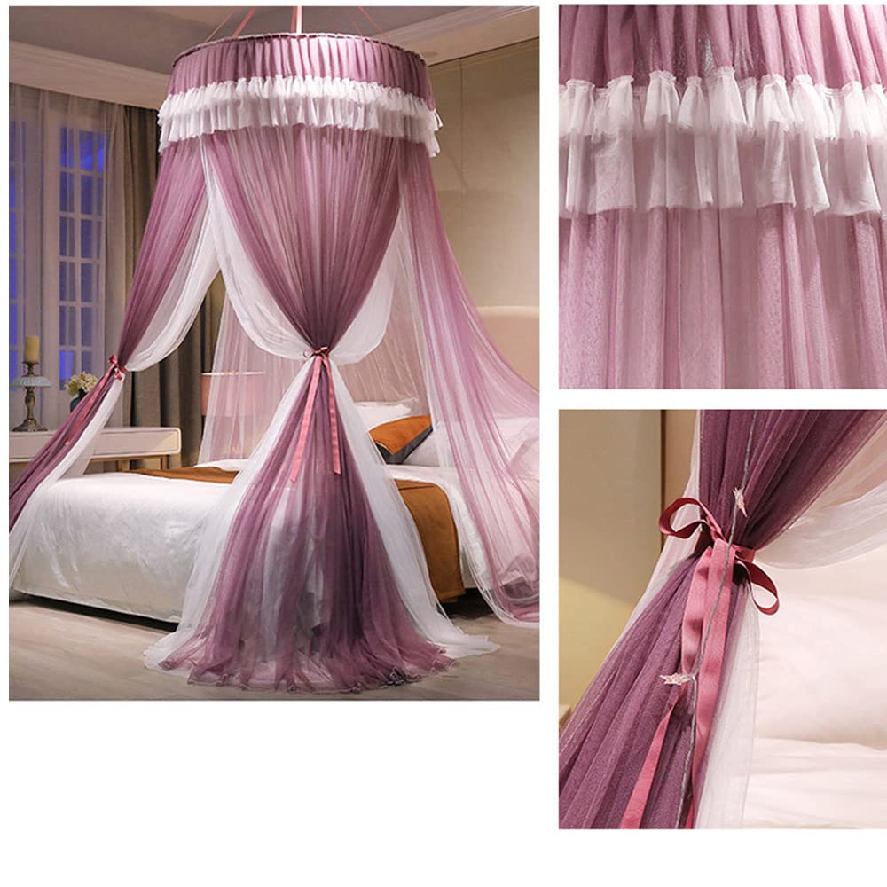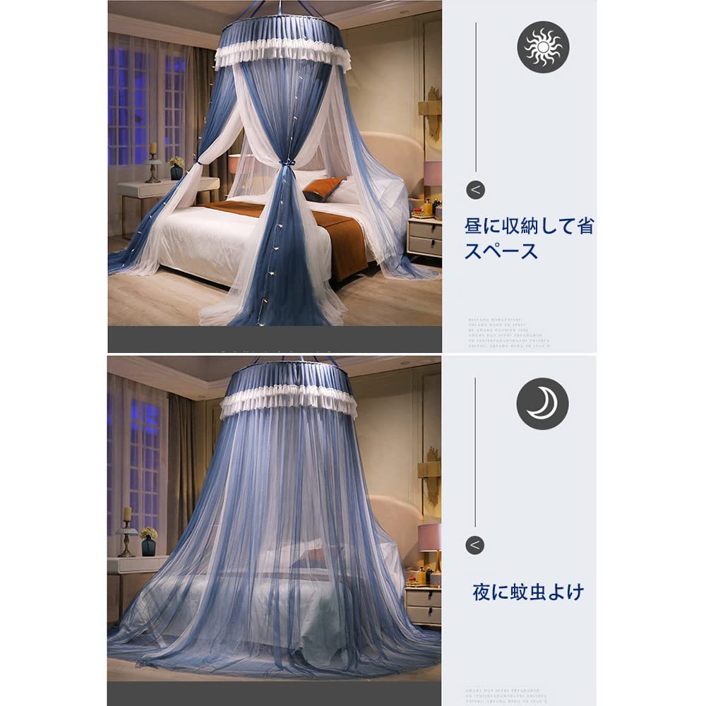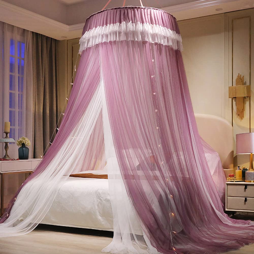 天蓋蚊帳 天蓋カーテン 円形蚊帳 直径110×高さ280cm 吊り下げ 三開け お姫様 防虫 防蚊 イルミネーション ライト別売り (パープル)