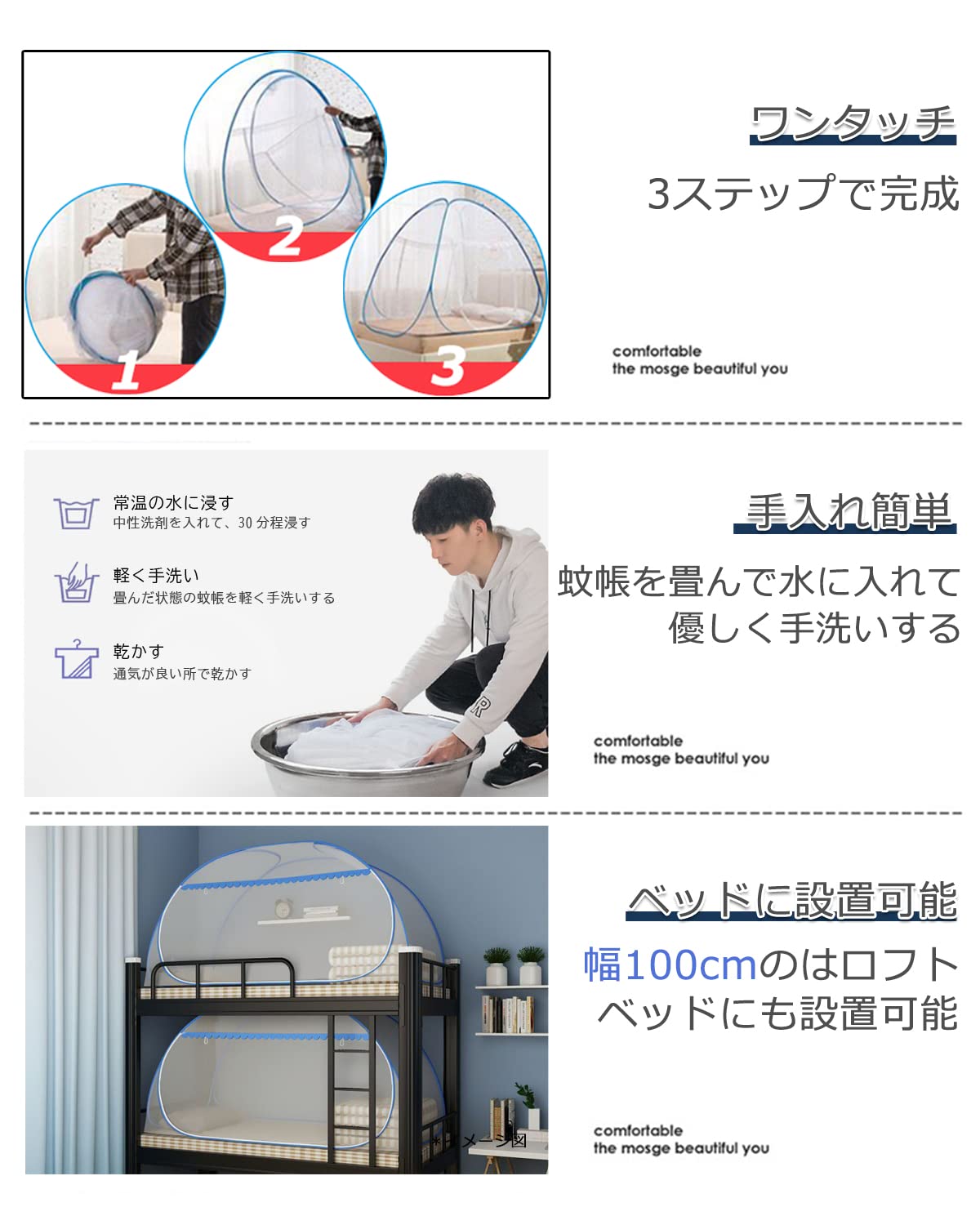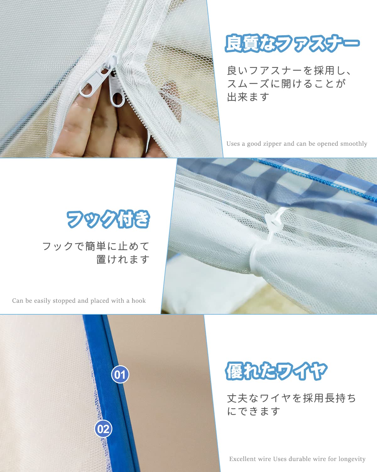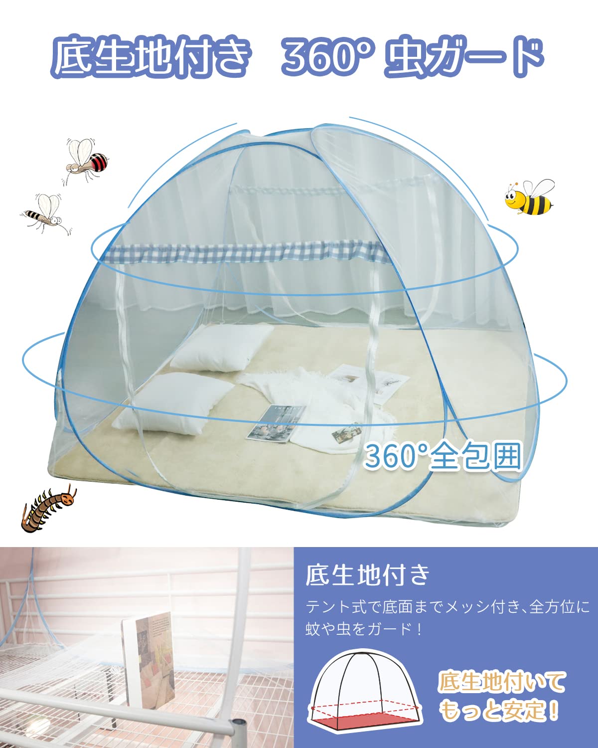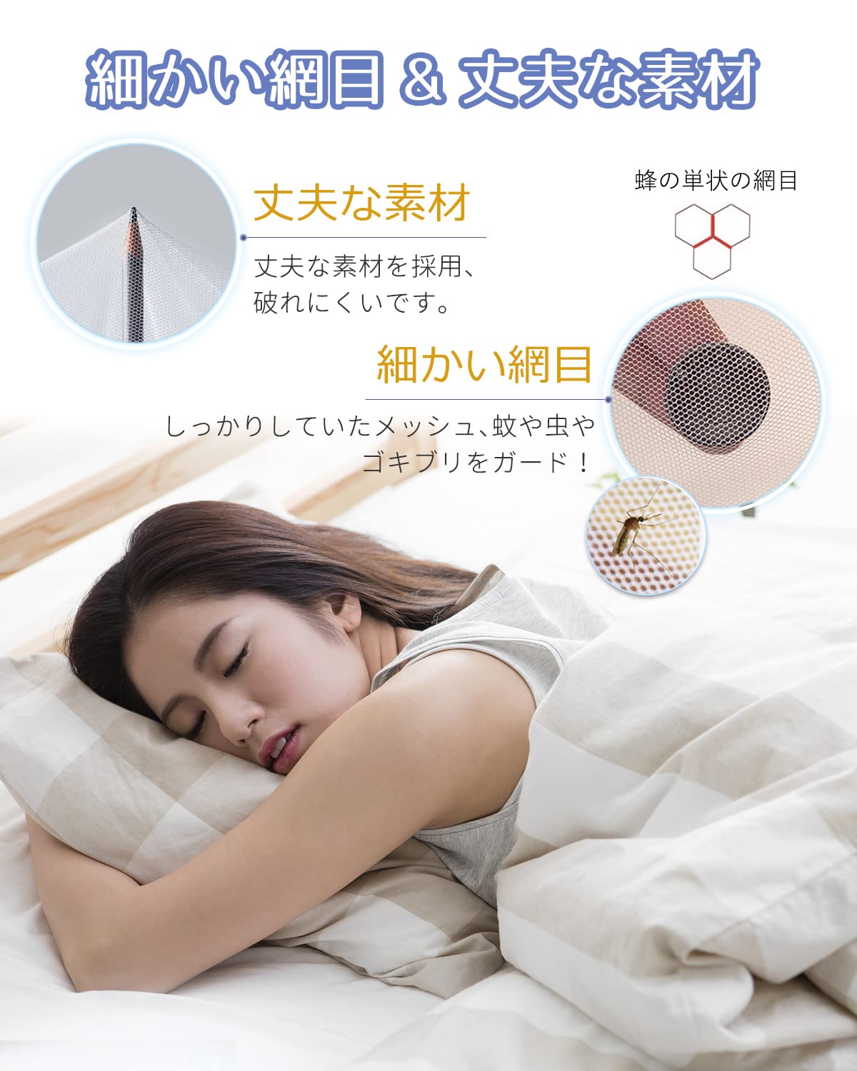 【高密度メッシュ生地で快適通気】通気性と防虫性を兼ね備えた高密度メッシュを採用、虫の侵入を防ぎつつ、空気をしっかり通すので蒸れにくく、寝苦しい夏でも安心して眠れます。底面にも細かいメッシュで、蚊やハエ、蜘蛛、ゴキブリなどの侵入を徹底ブロックできます。