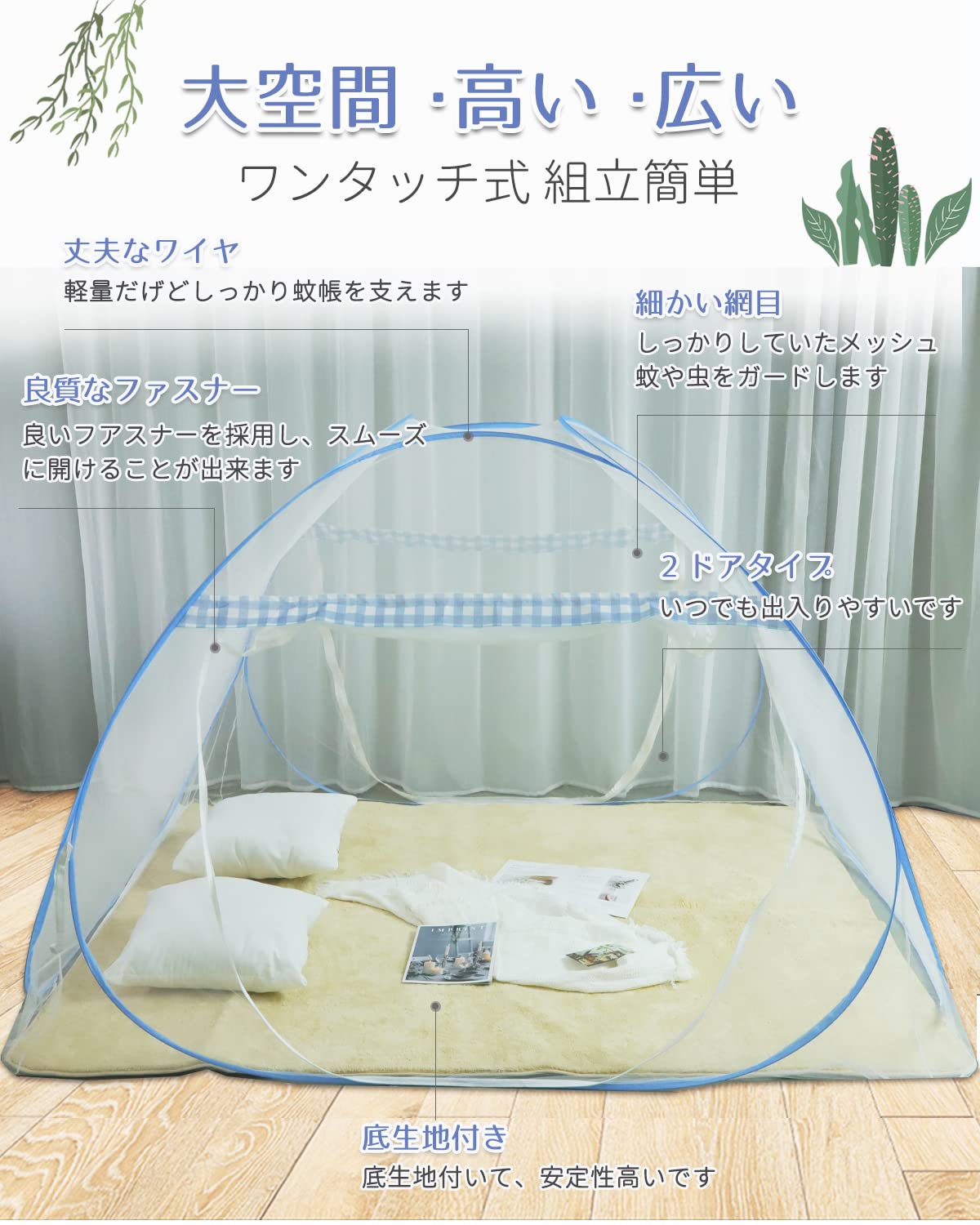 【ワンタッチ簡単設置】面倒な組み立て不要!開くだけで即使用可能なワンタッチ式蚊帳で、室内のベッド用はもちろん、モモンガ蚊帳、キャンプやアウトドアとしてもすぐに使えます。収納袋付き、コンパクトに折りたたみ可能で持ち運び便利です。