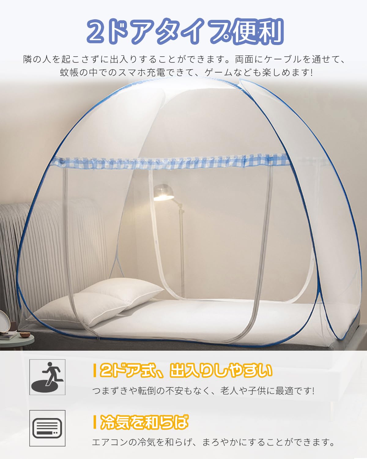【ダブルドア設計で出入り楽々】出入りがしやすい2ドアタイプで、出入りがスムーズです。両面ファスナー付き、内外どちらからでもスムーズに開閉可能。お子様や高齢者でも安心してご使用いただけます。