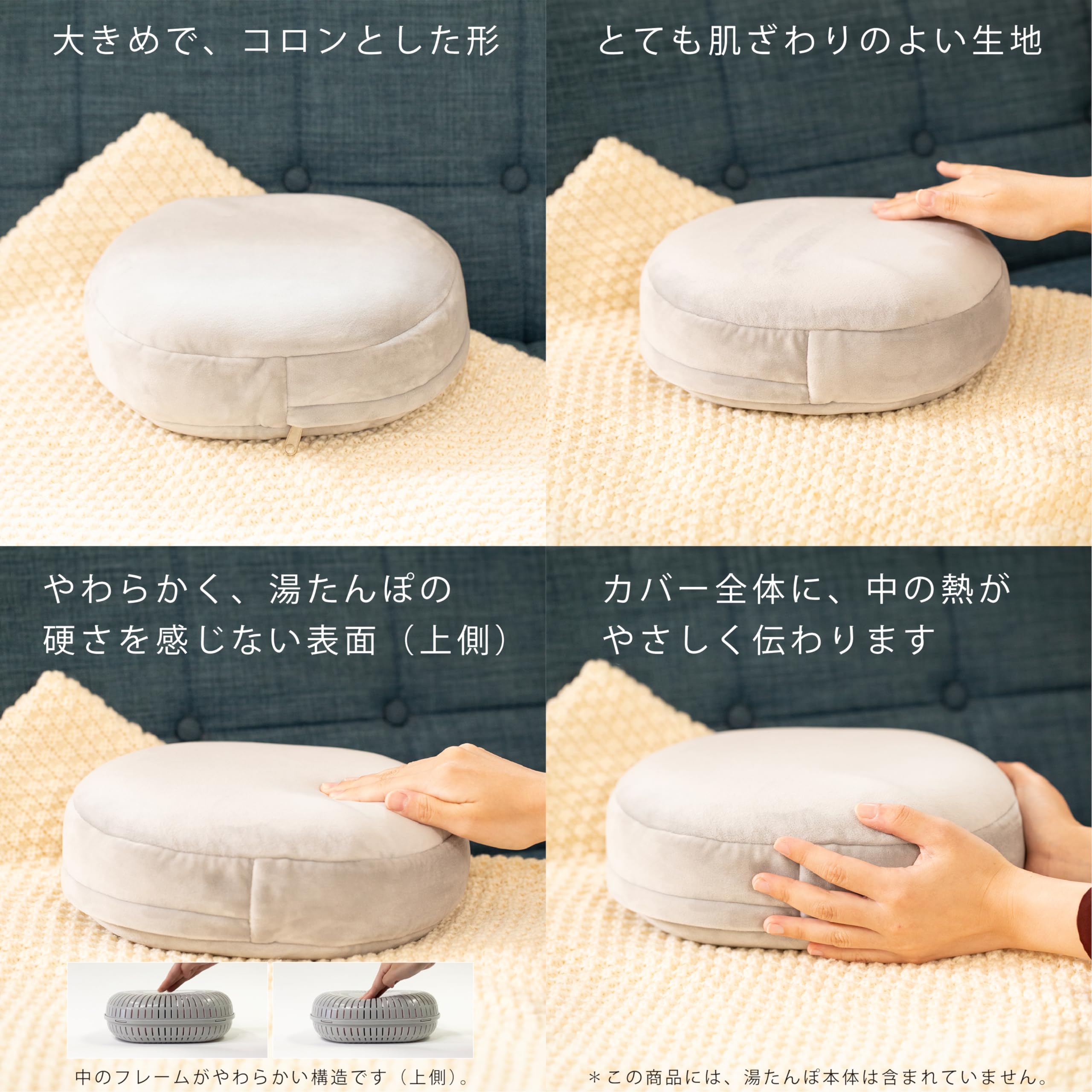 ●湯たんぽカバーは、肌ざわりのよい生地を使用し、内側の柔軟なフレームと合わせて使用することで、湯たんぽの硬さを感じることなく使用できます。