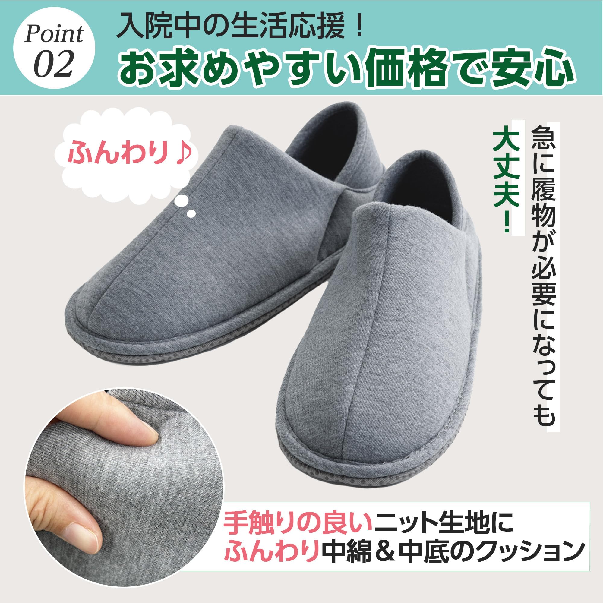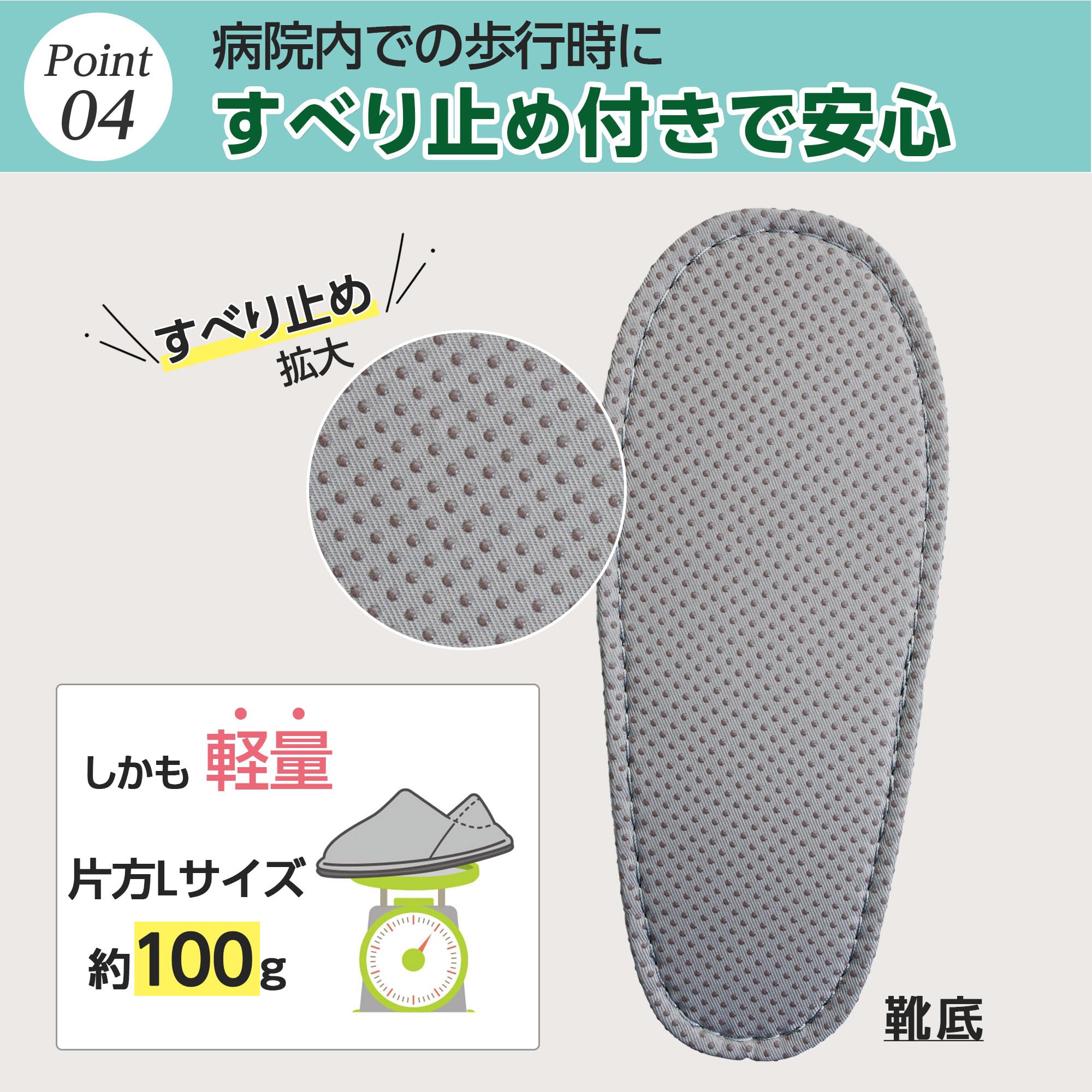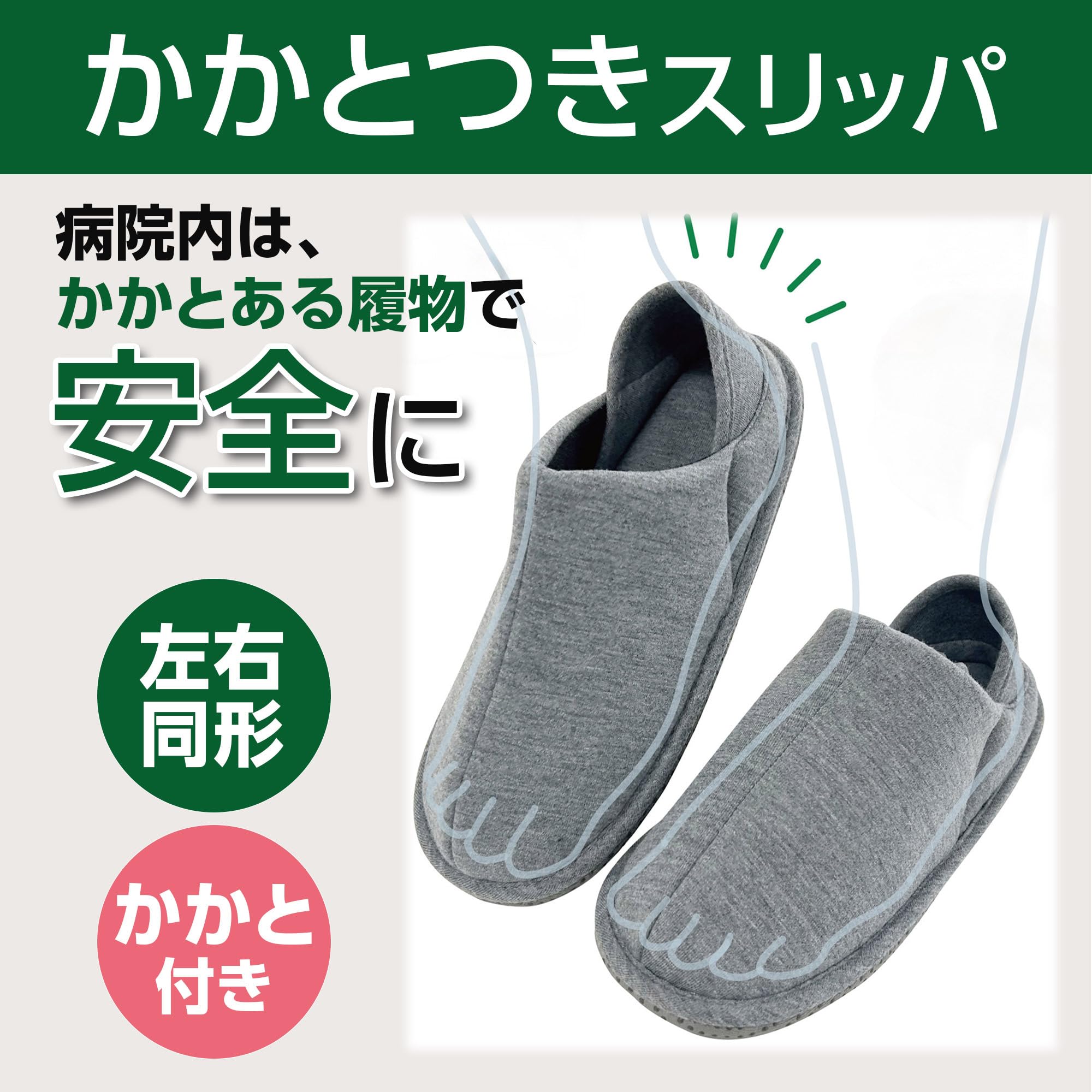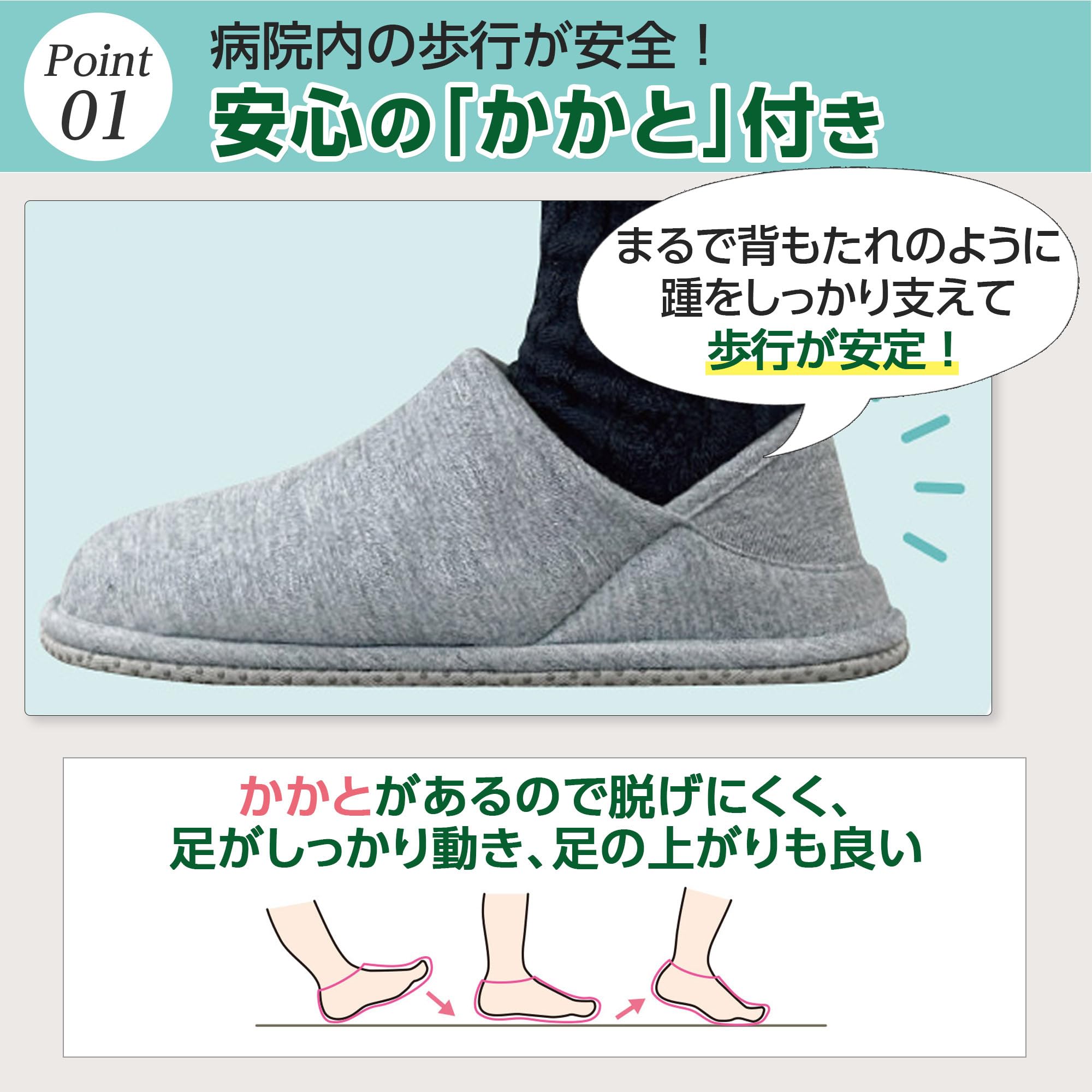 かかとが付いたスリッパで足元安心,短期入院の方にもおすすめ,左右同型のため履き間違えがありません,滑り止め付で安心な靴底,甲部分の立ち上がりで足入れしやすい