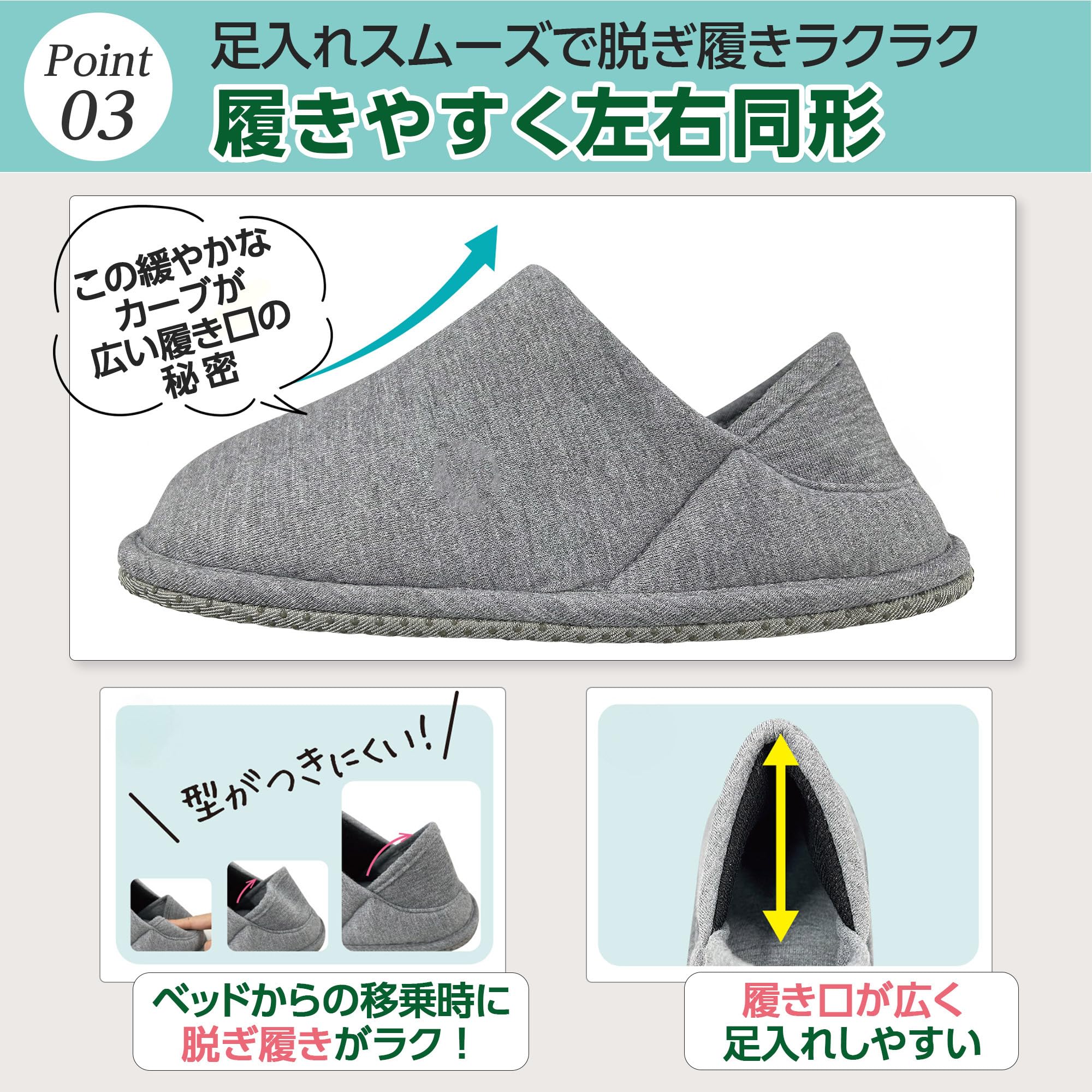 【脱ぎ履きがスムーズ】甲部分の立ち上がりで履き口が広く足を入れやすく作られているため、脱ぎ履きがラクに行えます。左右同型のため、履き間違えがありません。幅広い足にもご利用いただけます。ご自身で脱ぎ履きする方はもちろん、麻痺や車椅子の高齢者など介護補助が必要な方へのルームシューズとしても着脱しやすいです。プレゼントとしても。