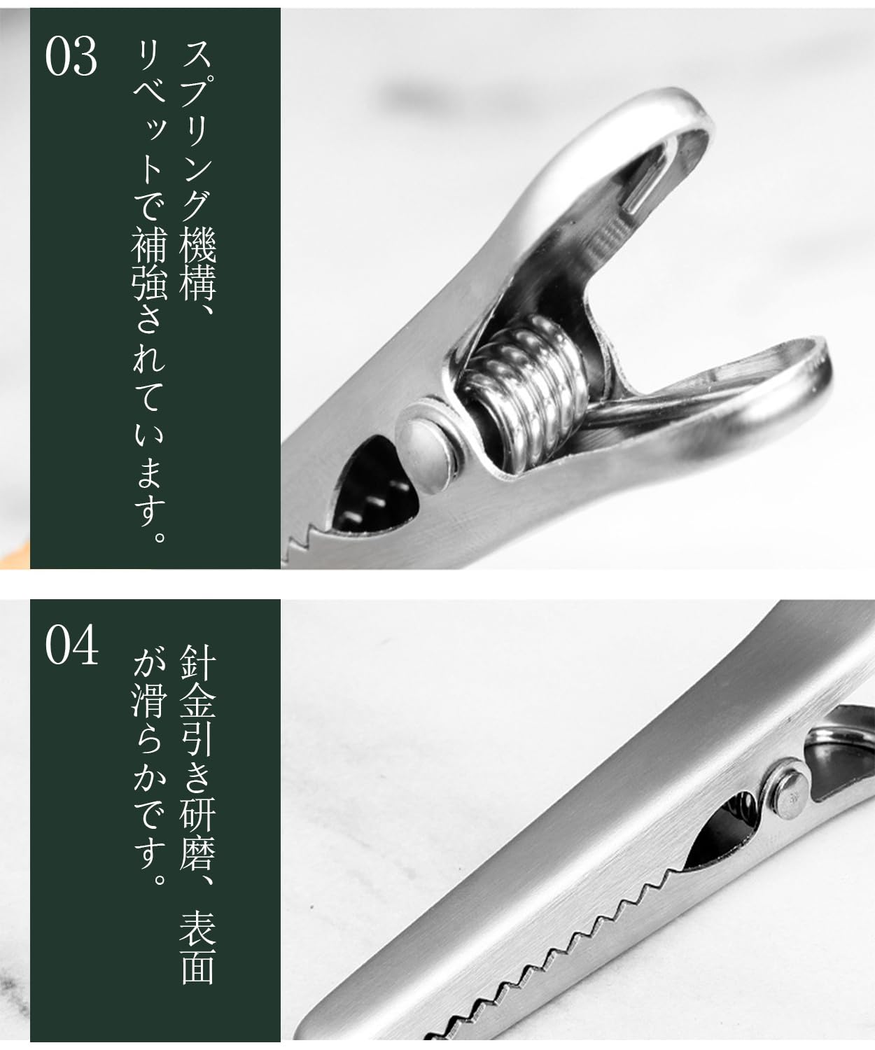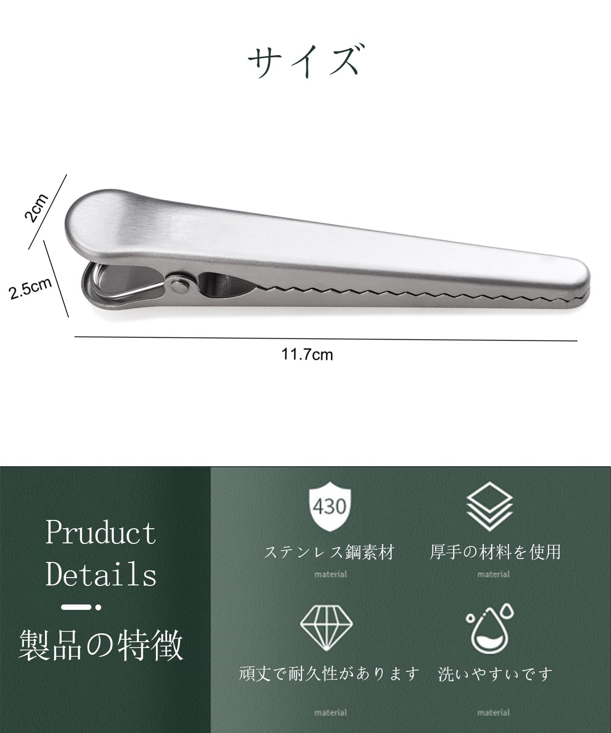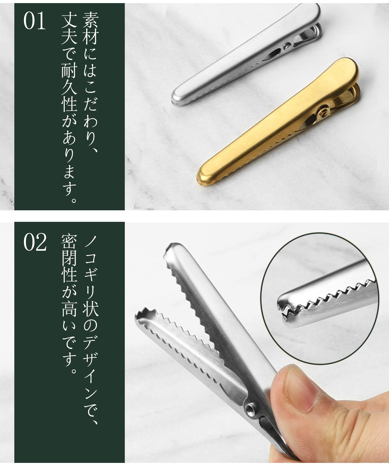 このシールクリップは高品質なステンレス素材を使用しており、頑丈で錆びにくい特性を持っています。湿気の多いキッチンや屋外での使用にも耐え、長期間にわたって新品同様の状態を保ちます。ステンレス素材は洗浄も簡単で、軽く拭くだけでピカピカに戻り、清潔で衛生的な使用を実現します。