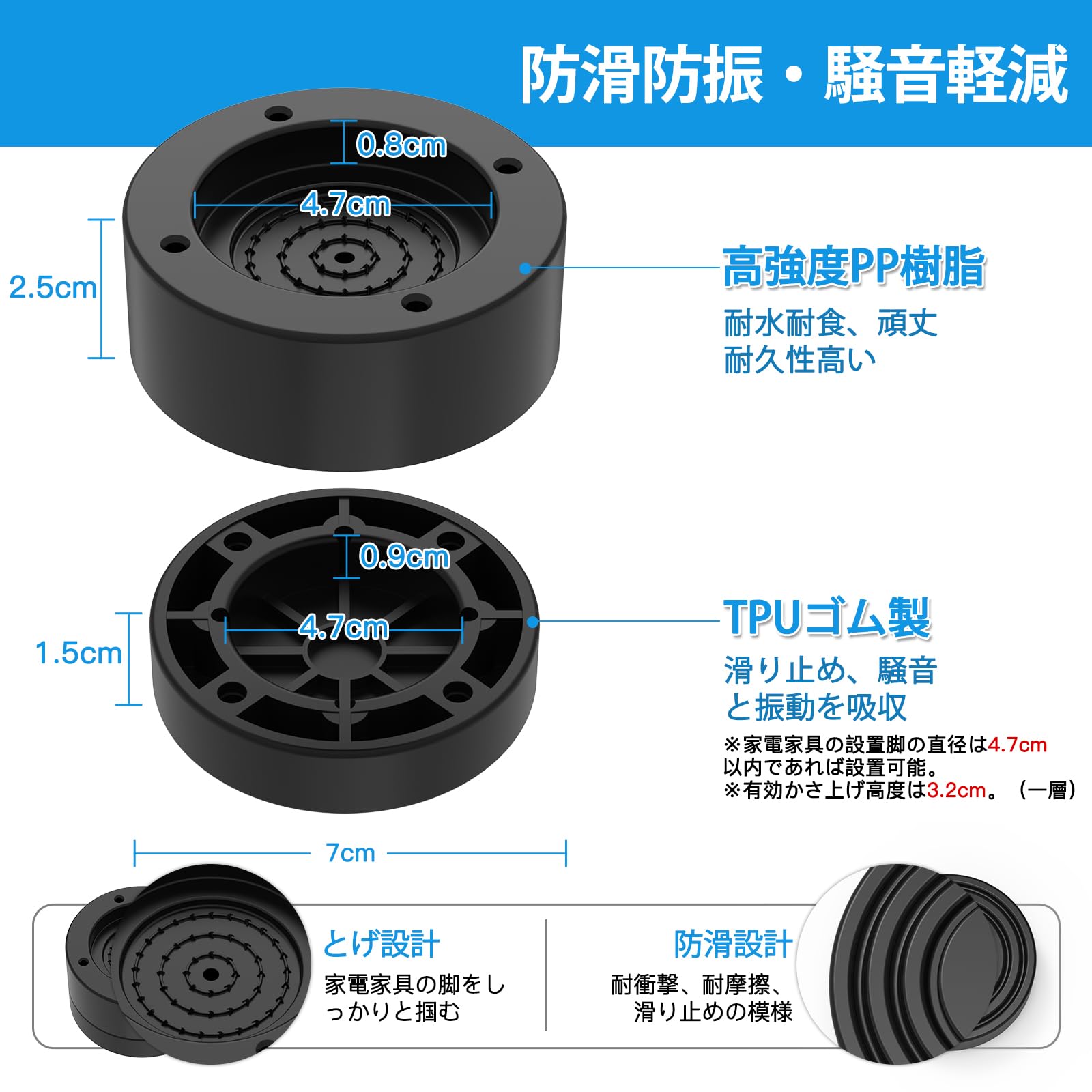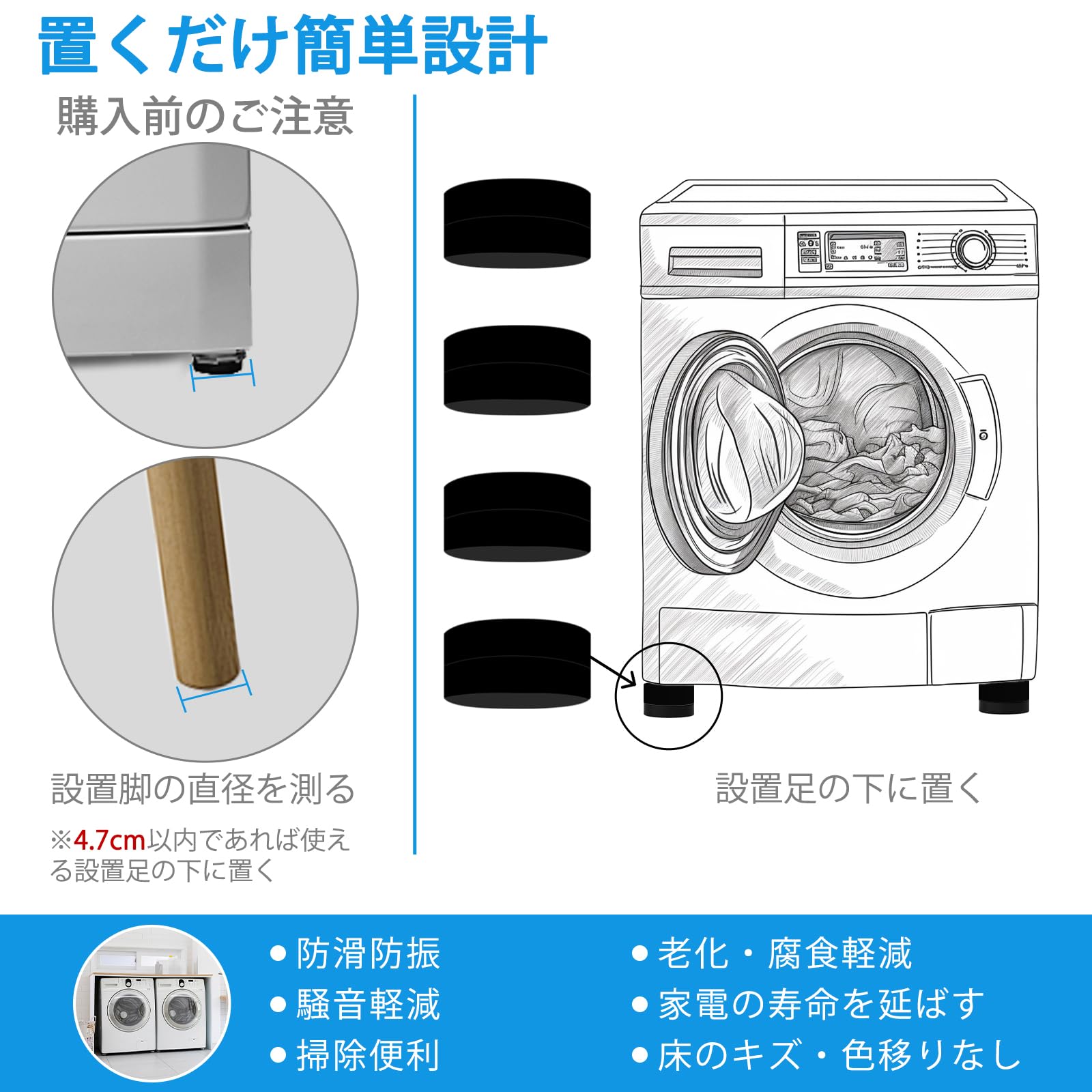 【多用途】家電/家具の脚の直径は4.7CM以内であれば設置可能。ほとんどの家電製品と家具の脚に合っているので、洗濯機、ドラム式、乾燥機、冷蔵庫といった大型家電のほか、机、ベッド、ソファーなども対応可能!適用対象が多い!置くだけ簡単!