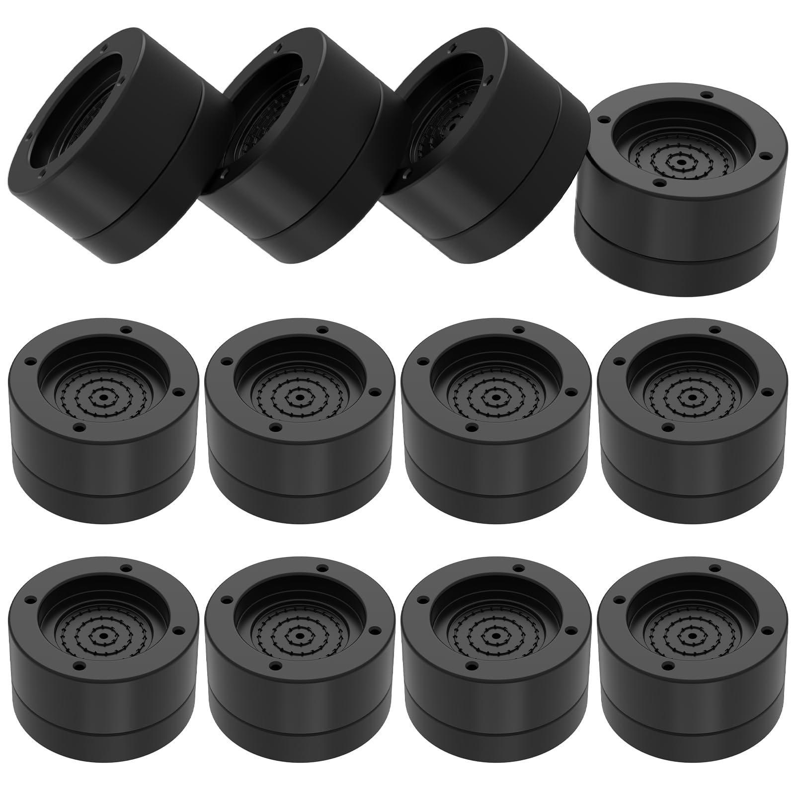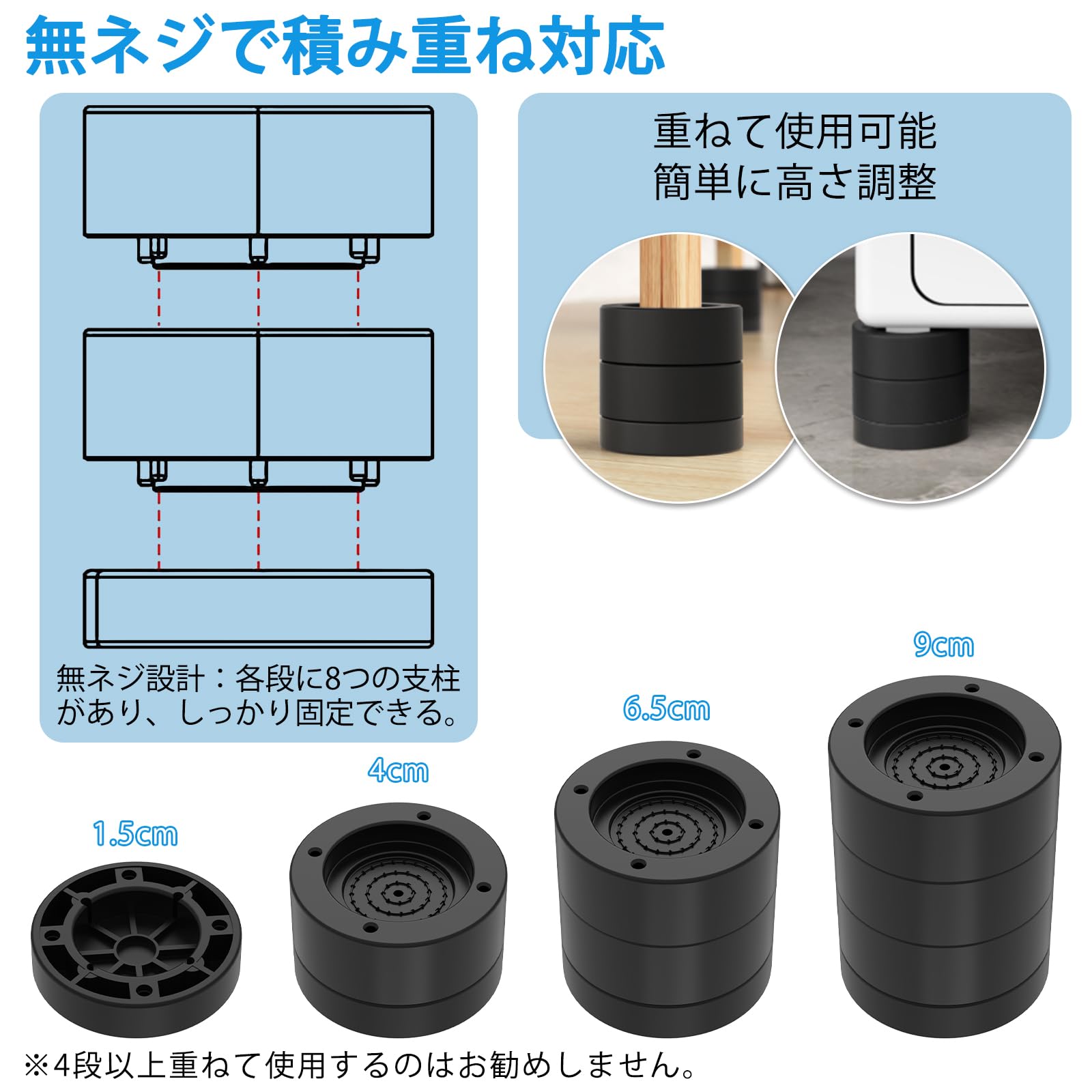 【仕様】色:ブラック 高さ:4CM(2.5+1.5CM) 内径:4.7CM 直径:7CM 12点セット 重ねるだけで使え、簡単に高さを調整できる!3段重ねると9cmの高さができます。耐加重:300KG(4個使用時)