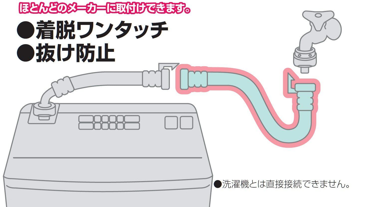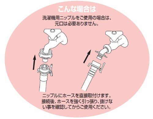 【注意】1989年以前の東芝、1992年以前のサンヨー、1992年のNECの各給水ホースには適合しません。又、洗濯機とは直接接続できません。既存の洗濯水栓や洗濯ニップルに直接接続するため、元口の付属はありません。