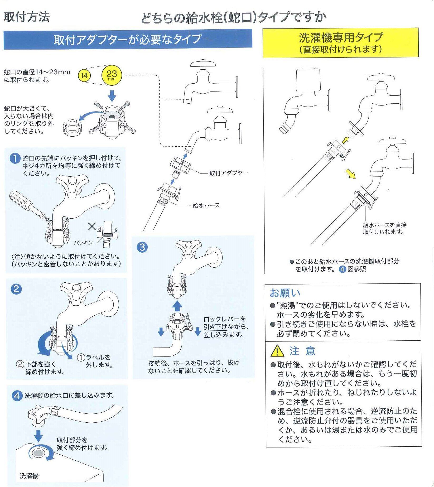 ●給水ホースの水もれ、洗濯機の移動による交換に最適です。 ●給水ホースがワンタッチで着脱できます。 ●ロックレバーで脱落を防止します。 ●耐水圧、耐寒、耐熱性にすぐれた安心設計。