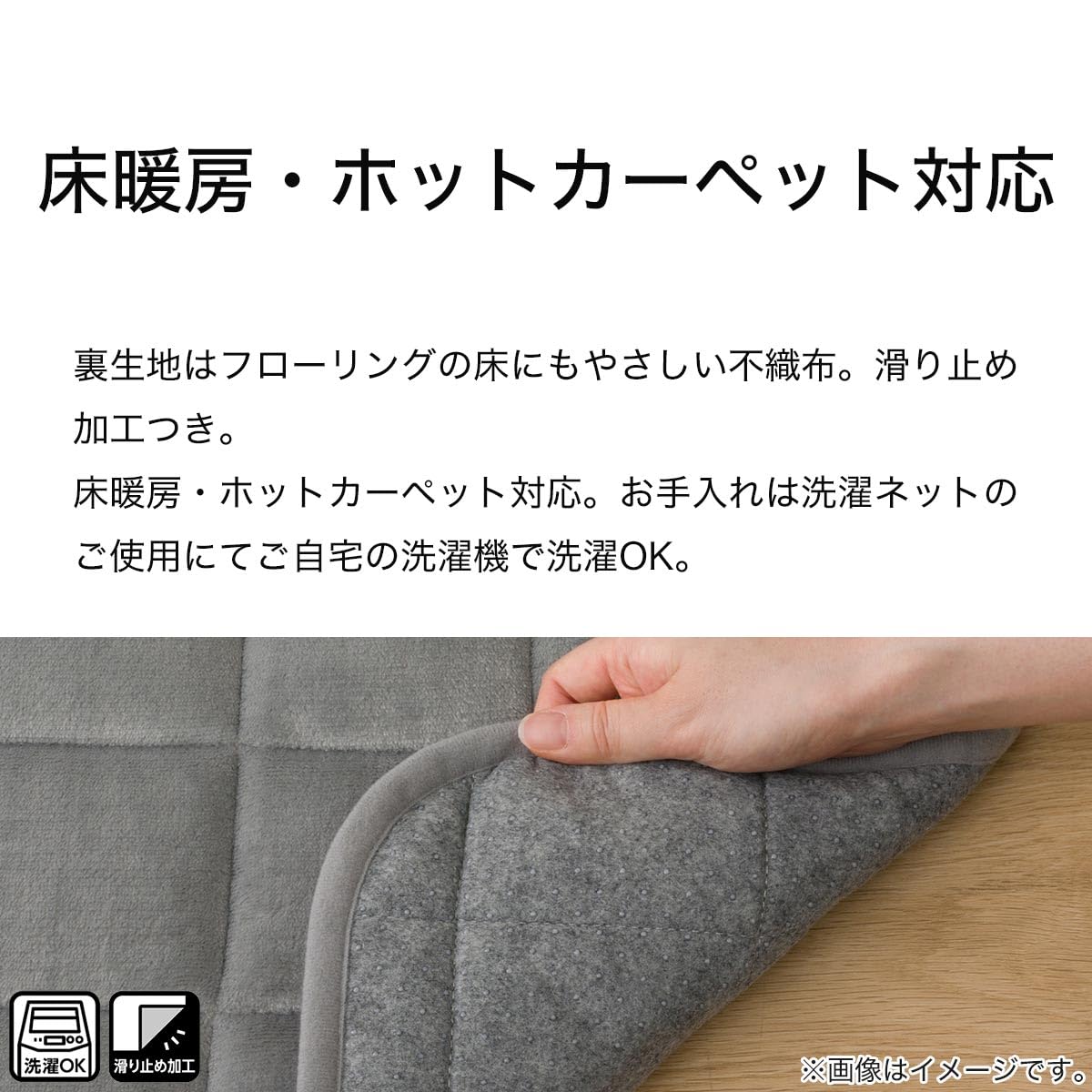 床暖房・ホットカーペット対応。お手入れは洗濯ネットのご使用で、ご自宅の洗濯機で洗濯OK。