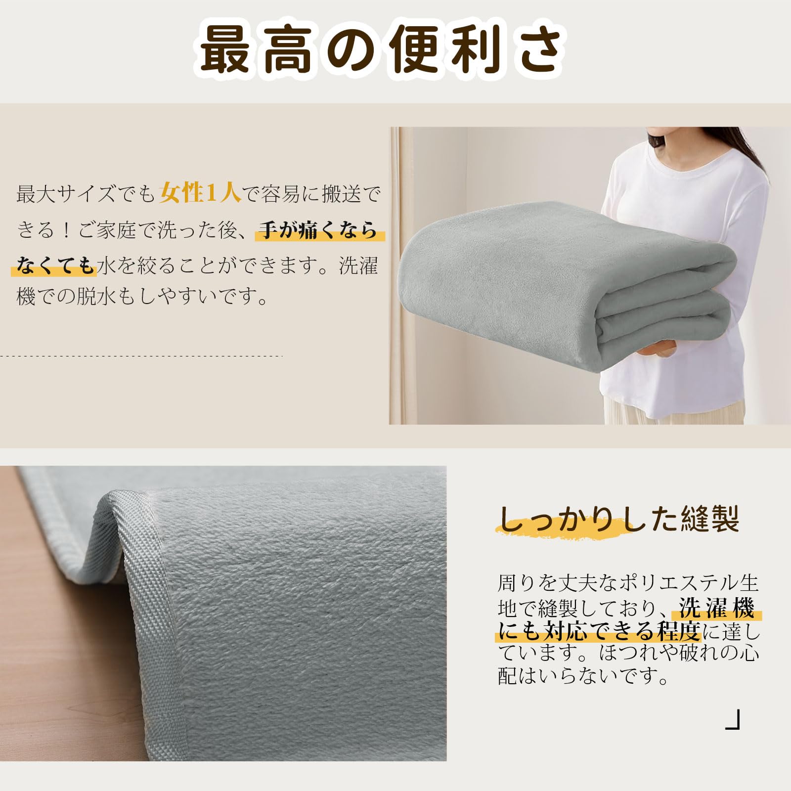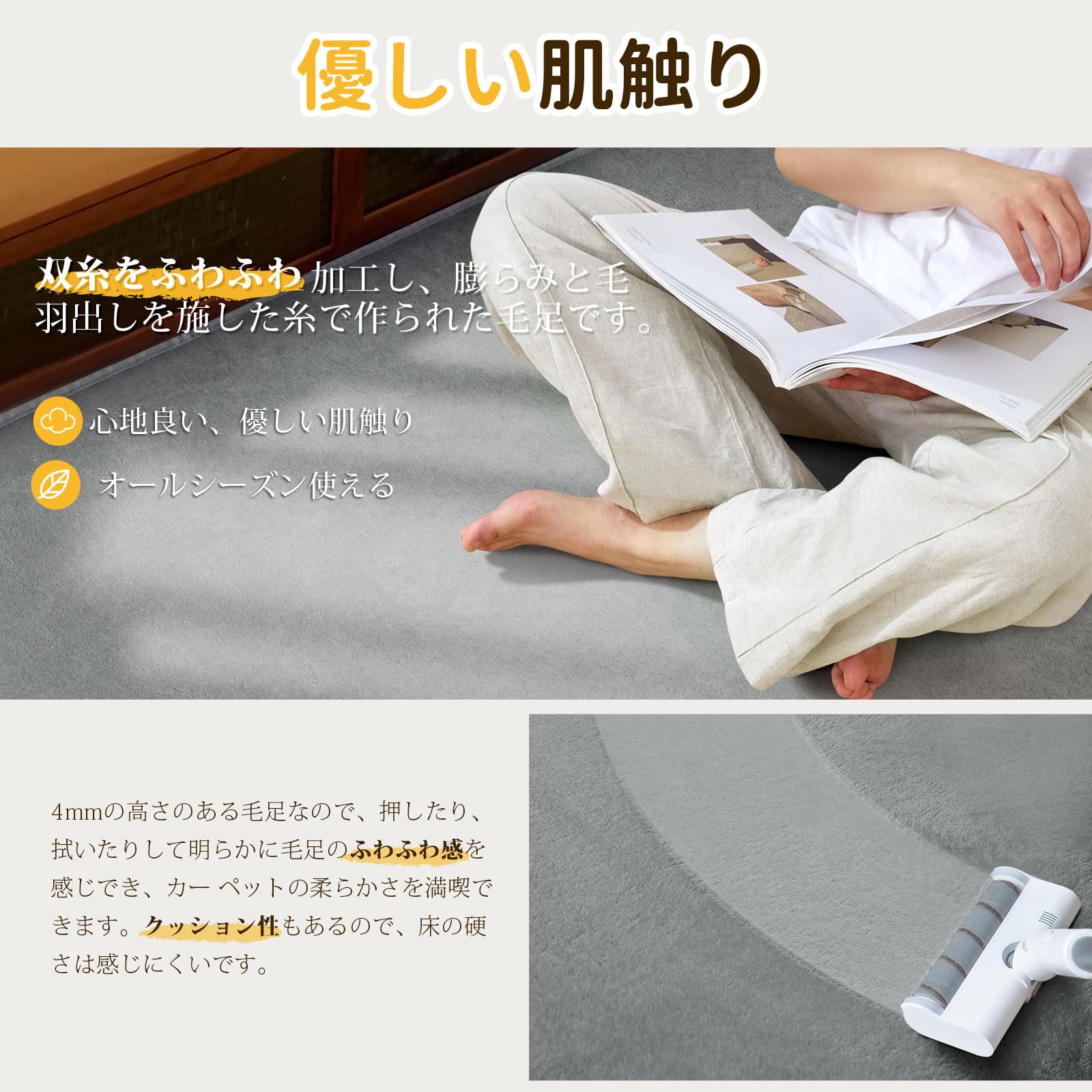 【優しい肌触り】毛足は双糸をふわふわ加工し、膨らみと毛羽だしを施した糸で作られ、心地良い、優しい肌触りを実現しました。毛足の長さは4mmで、暑くも寒くも感じないです。