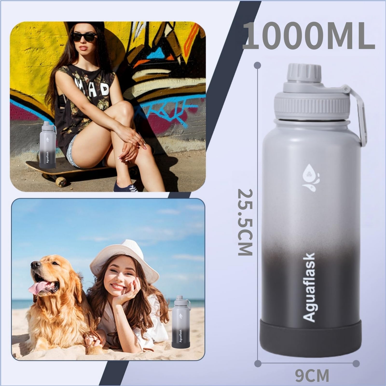 JINLING 魔法瓶 スポーツボトル 真空断熱 保冷保温 大容量 水筒 ステンレス鋼304 直飲み 0.6/1リットル (黒と灰色, 1000ml)