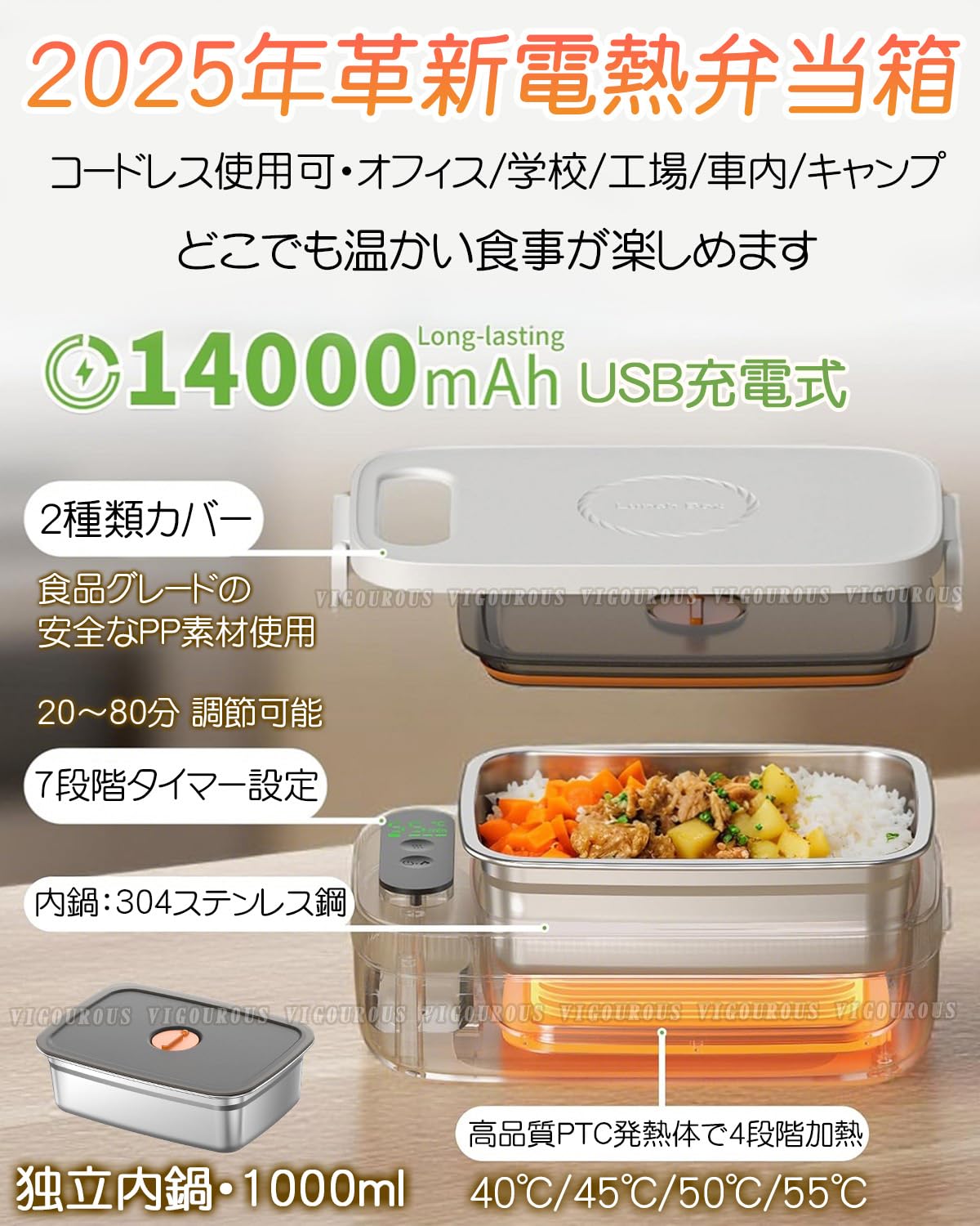【2025年コードレス使用可・14000mAh】電気弁当箱 usb充電式 1000ml大容量 注水不要 自熱式 304ステンレス 7段階定時機能 4段階55℃高速加熱 デジタル表示 Type-C充電対応 保温弁当箱 ランチボックス 可脱着式内胆 携帯便利 職場/オフィス/車内/旅行/ピクニック/アウトドア対応