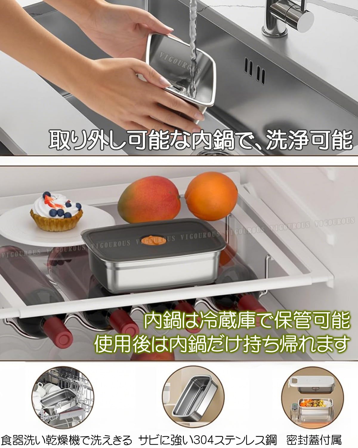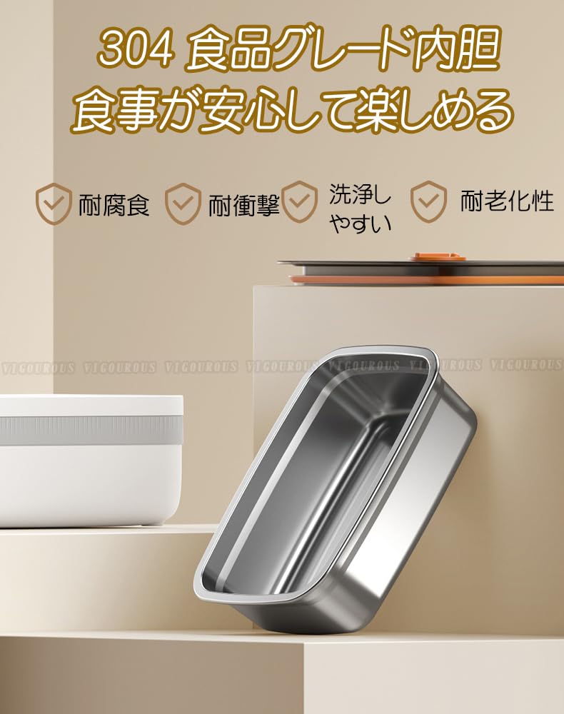 【食品級素材で健康守る】:電気弁当箱の内なべは304ステンレス製、外装は食品級PP素材を使用。無毒、無臭、耐腐食性で、BPAなどの有害物質を含みません。調理準備から加熱、食事まで、毎食を強力に守ります。