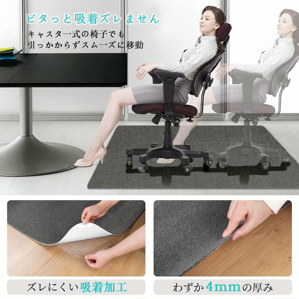 【キズ防止】キャスター付きの椅子の中には、床を傷つけたり、足跡を残したり、床をへこませたりするものがあります。 滑り止めマットを床に置くと、引っかき傷、汚れ、へこみを防ぐことができます。 床ヘしっかり吸着し、椅子を動かす際にズレにくく、床を傷や凹みから守ってくれる。椅子がスムーズに動かせ、より快適なテレワークを実現