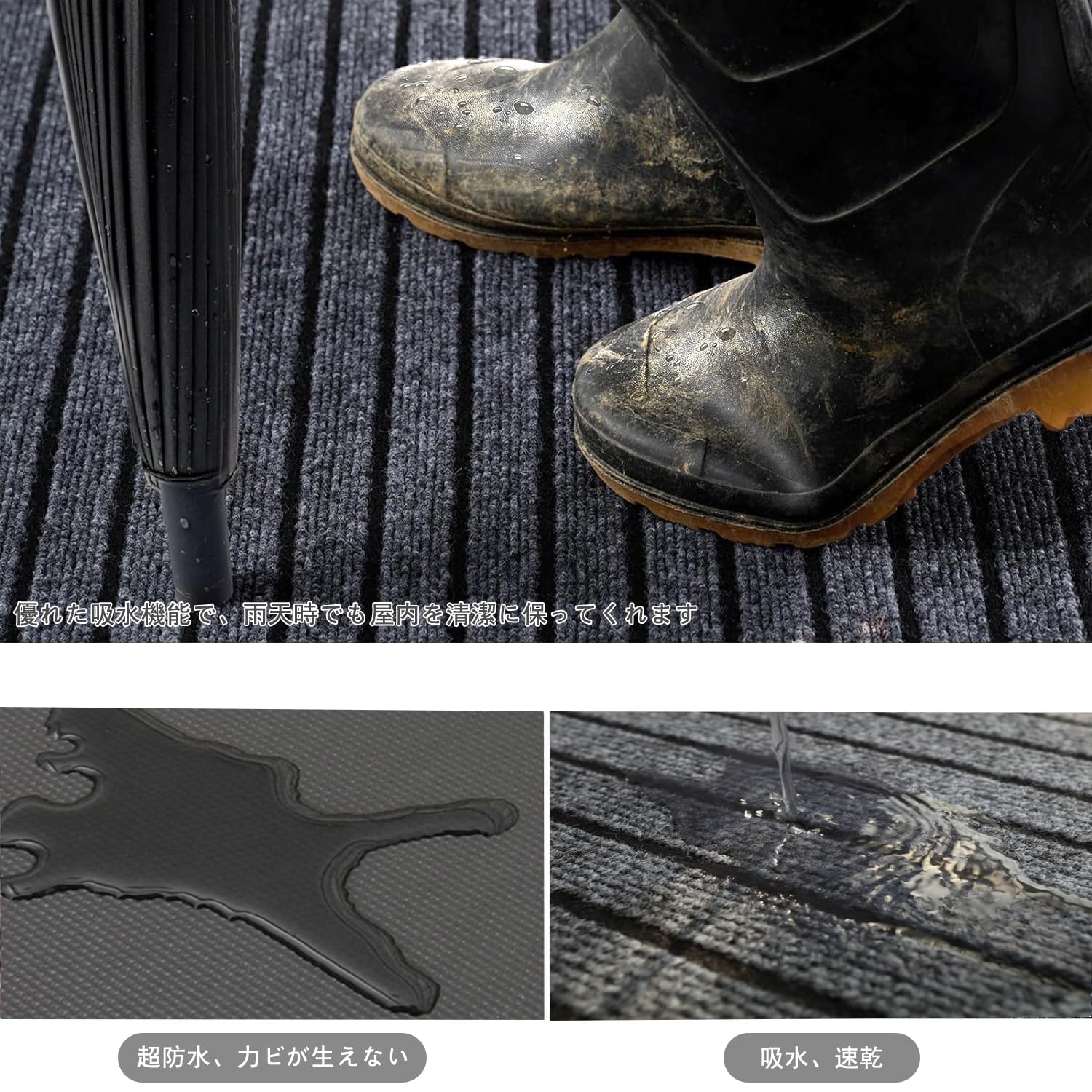 【泥落とし、吸水】屋内、屋外でお使いいただける泥落としマットです。長い梅雨の日でも大雪の日の中でもフロア汚れを最小限に抑えます!また、マットが抗菌性・防臭性、一年中も快適にご使用いただけます