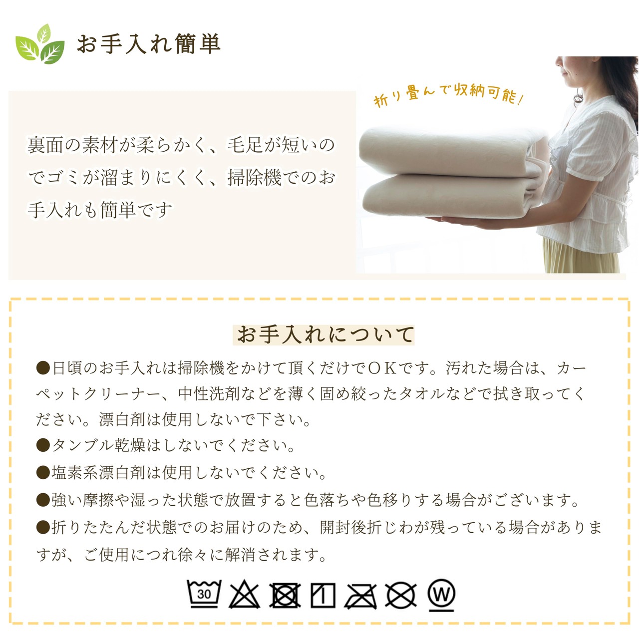 【お手入れも簡単】裏面の素材が柔らかく、毛足が短いのでゴミが溜まりにくく、掃除機でのお手入れも簡単です。