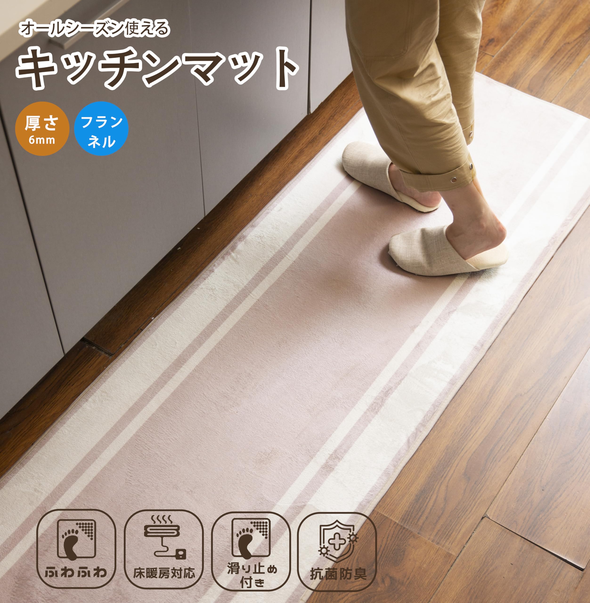 キッチンマット 台所マット 60×180㎝ 微はっ水 ホットカーペット対応 フランネル ふわふわ 北欧 ボーダー柄・さくら