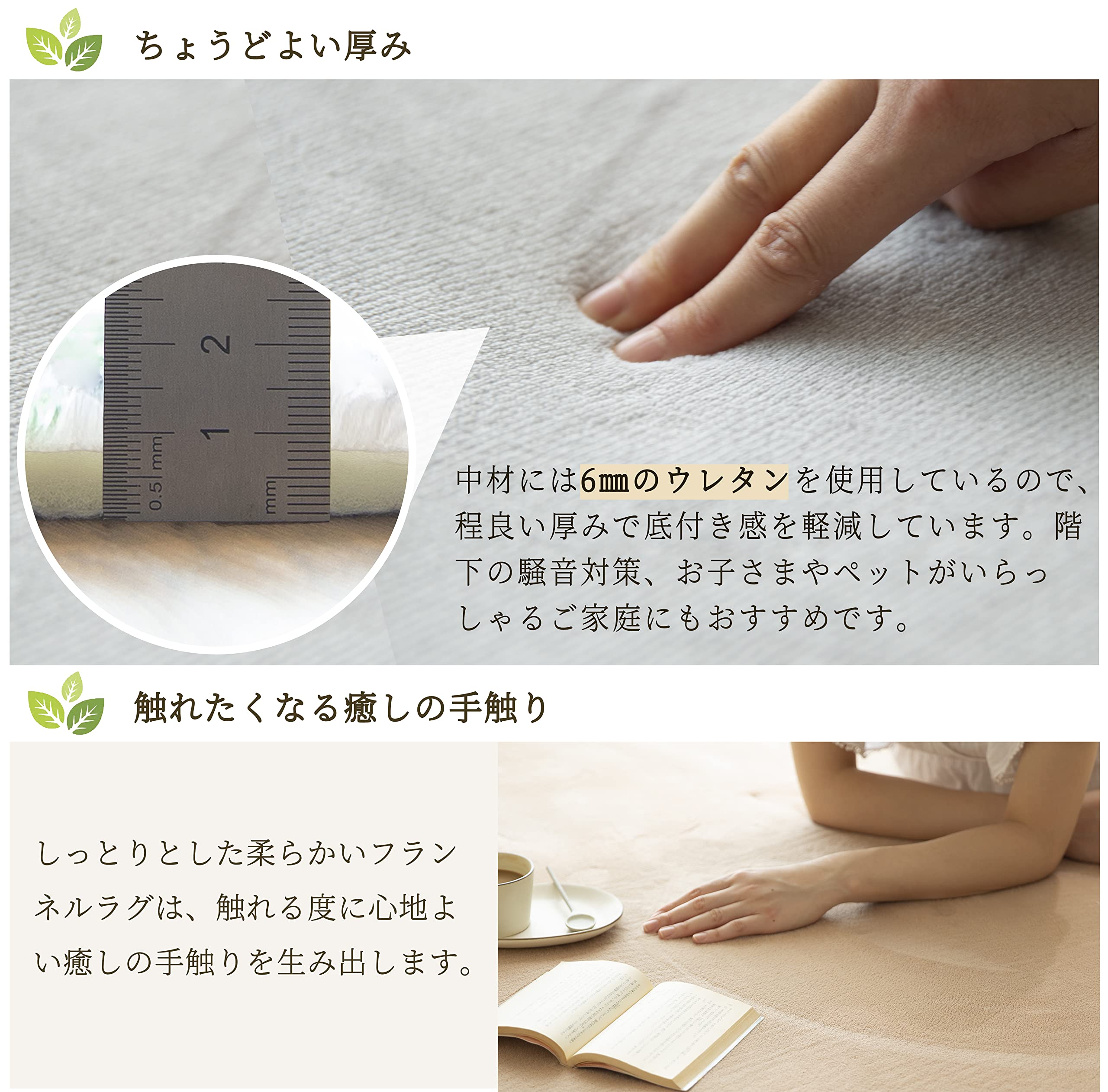 【心地よいクッション性】中材には6mmの低反発ウレタンを使用しているので、程良い厚みで底付き感を軽減しています。階下の騒音対策、お子さまやペットがいらっしゃるご家庭にもおすすめです。