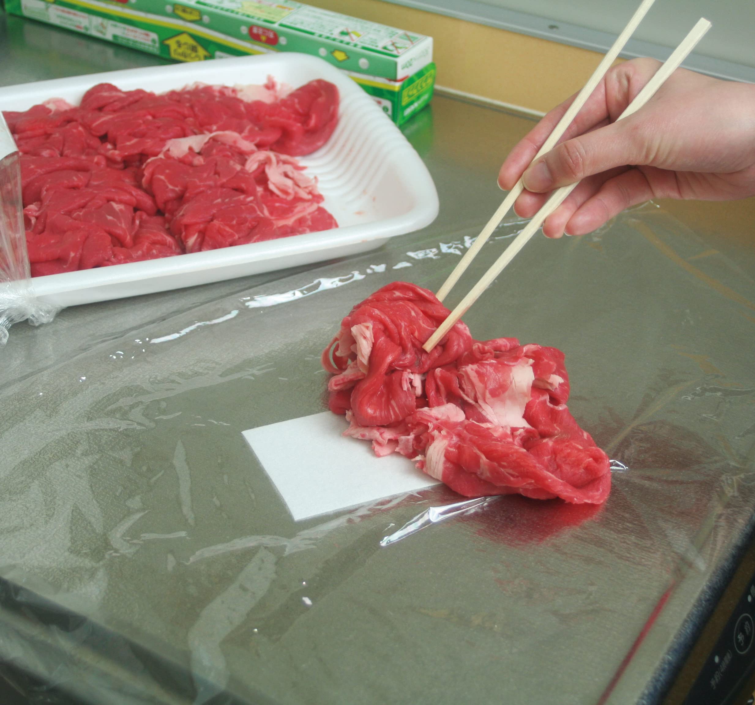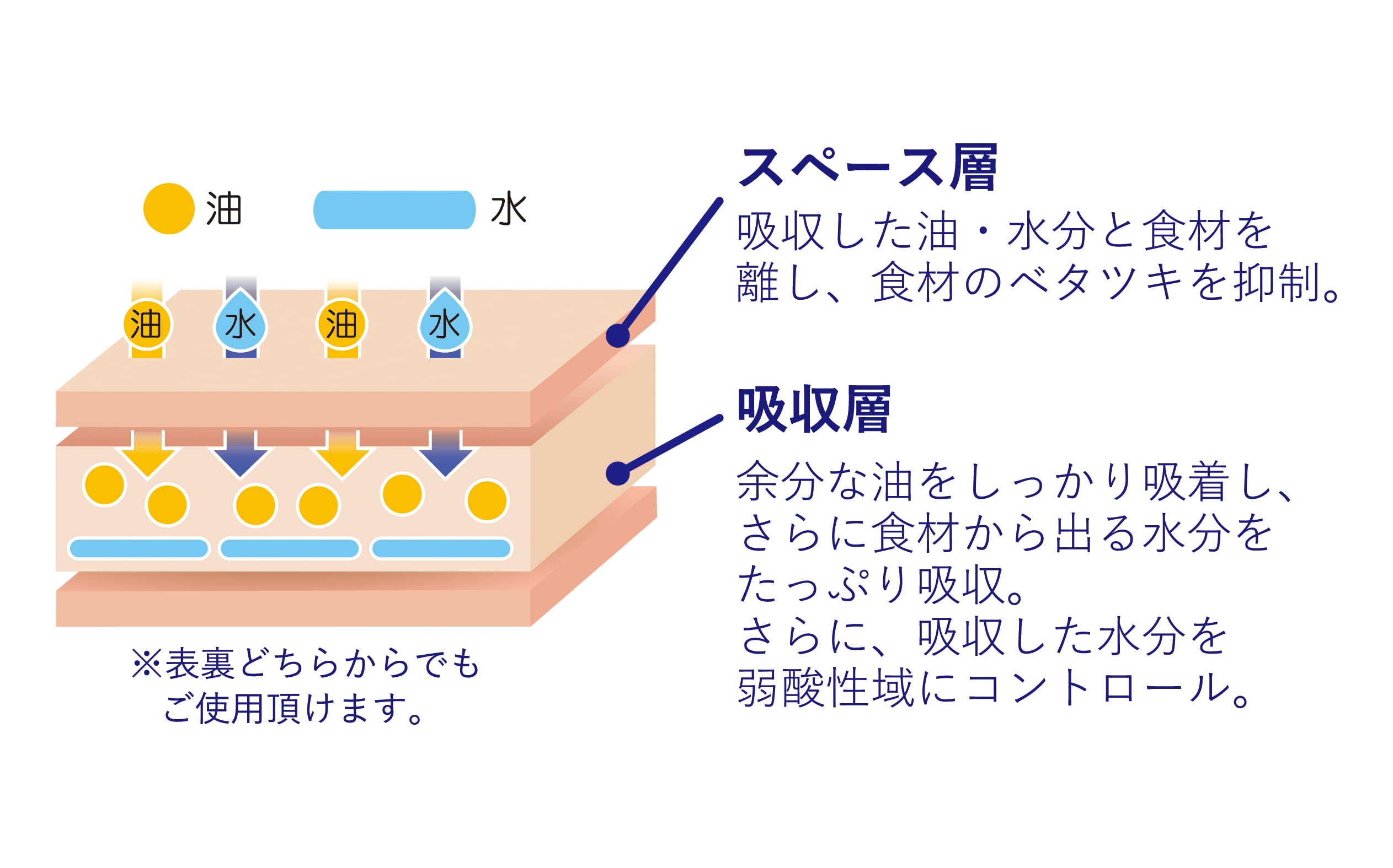 3層構造の不織布シートが油・汁を吸収。食材のベタつきを抑えてくれる。冷凍小分け時に一緒に敷いて置くと、解凍時の不要な水分を吸収してくれる。