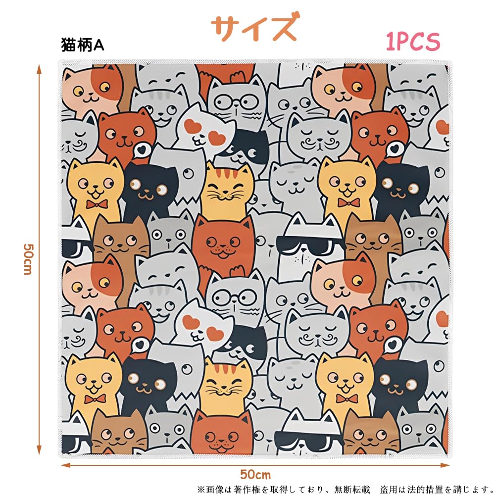 くっつきタオル 巻くだけ保冷ランチクロス 50*50cm 風呂敷 大判 お弁当包み くっつくタオル 折り畳み くっつくクロス カメラ 弁当箱 傘 化粧品 タブレット ペットボトル 水筒 (猫柄A)